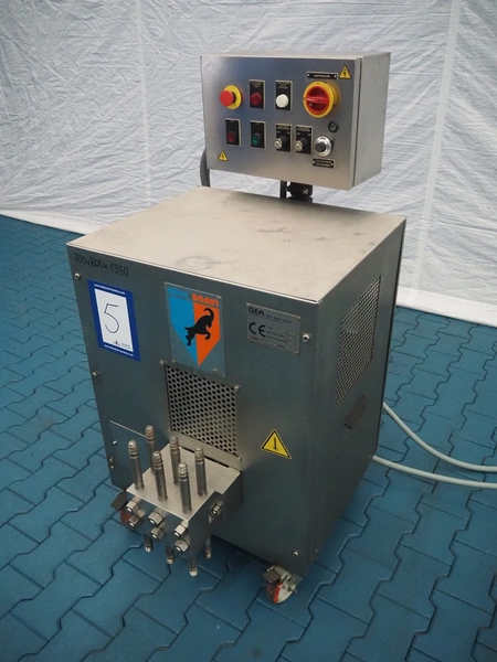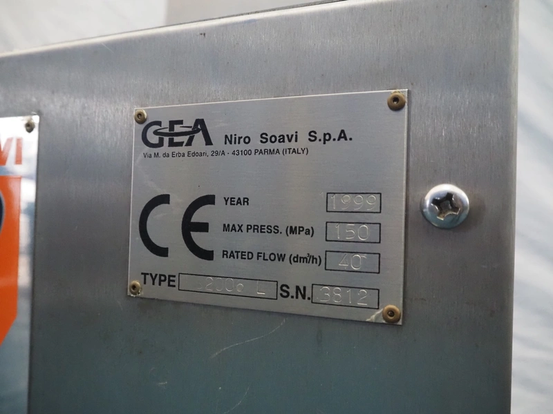 GEA Niro Soavi S.p.A. homogenizer, type: 2006 L, serial number: 3812, year of construction: 1999, maximum pressure: 150 Mpa, rated flow: 40 dm³ per hour, dimensions: 880 mm x 670 mm x 1370 mm.