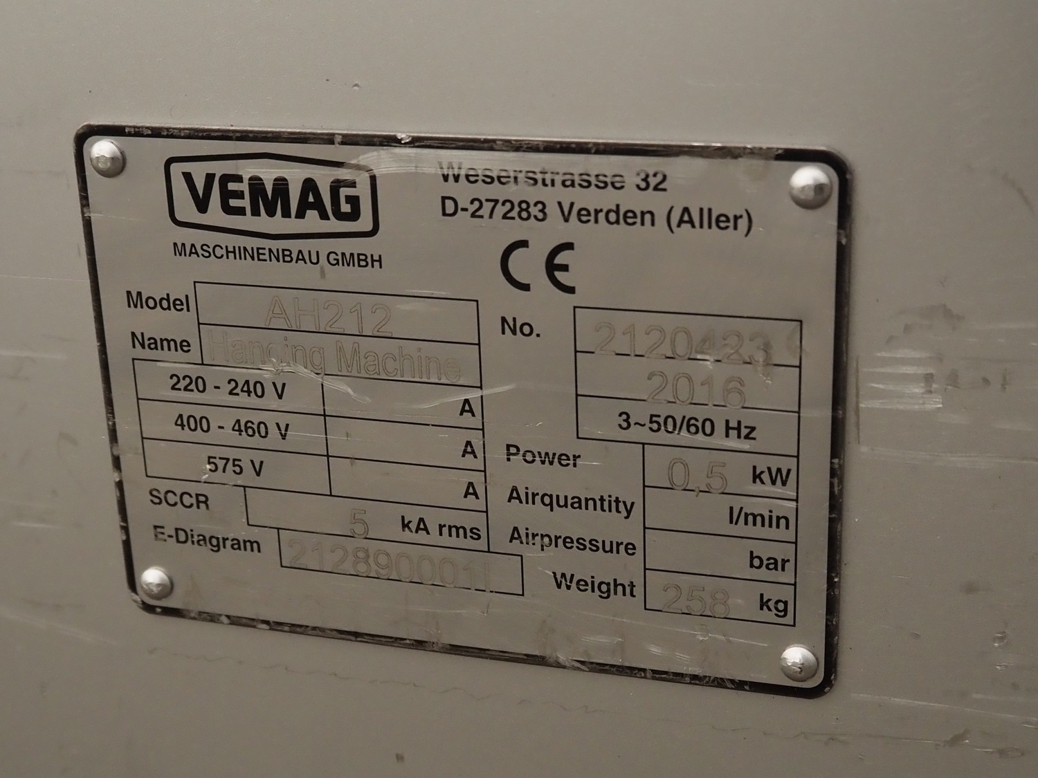 Vemag mobile length portioning line, consisting of: Vemag mobile high-speed length portioning machine, model: LPG 208, number: 208890003, year of construction: 2009, 400-460 V, 3 Ph, 50/60 Hz, 10 a, 6 kW, dimensions: 1740 mm x 930 mm x 1300 mm and Vemag mobile hanging line, model: AH 212, number: 2120423, year of construction: 2016, dimensions: 3620 mm x 760 mm x 1520 mm.