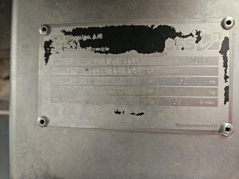 CFS Slagelse A/S double shaft paddle mixer, type: UNIMIX I 2500, machine number: 5000068168 POS 26, year of construction: 2011, 400 V, 3 Ph, 50 Hz, 41.2 A, 22 kW, volume: 2500 liter, dimensions: 4600 mm x 2200 mm x 2500 mm.