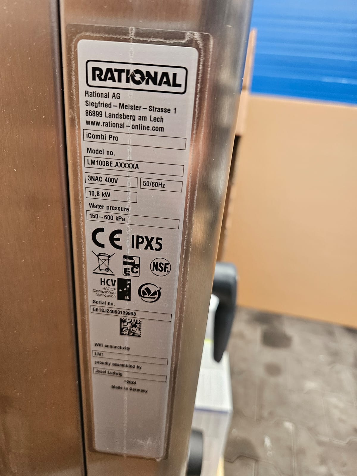 Rational combisteamer, iCombi Pro, model: LM100BE.AXXXXA, serial number: E61SJ24053139998, year of construction: 2024, 400 V, 3 Ph, 50/60 Hz, 10,8 kW, electric heated, dimensions: 900 mm x 900 mm x 900 mm. Never used, still in box.