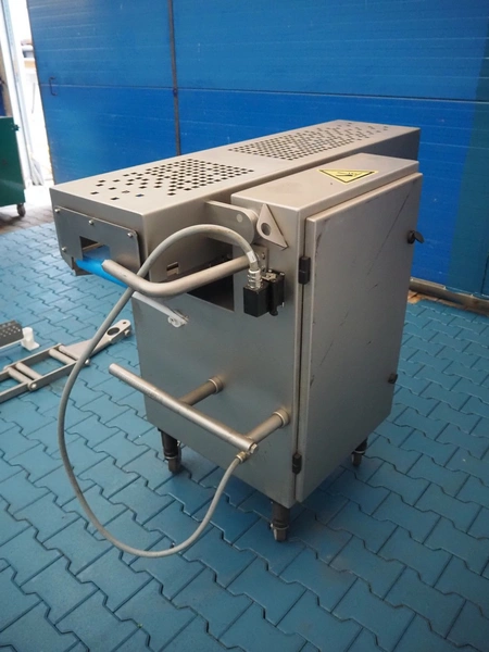 Handtmann mobile minced meat portioner, type: 99-2, number: 33909, year of construction: 2014, working width: 240 mm, plastic belt, belt width: 250 mm, total dimensions: 1380 mm x 700 mm x 1240 mm.