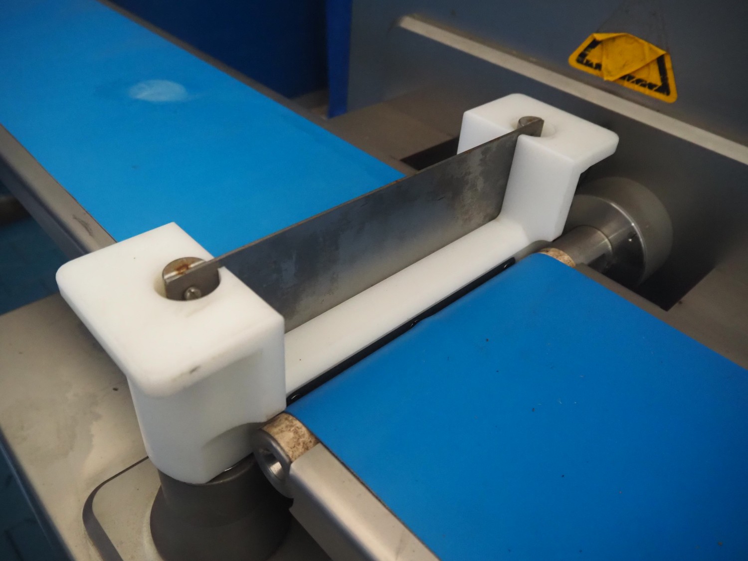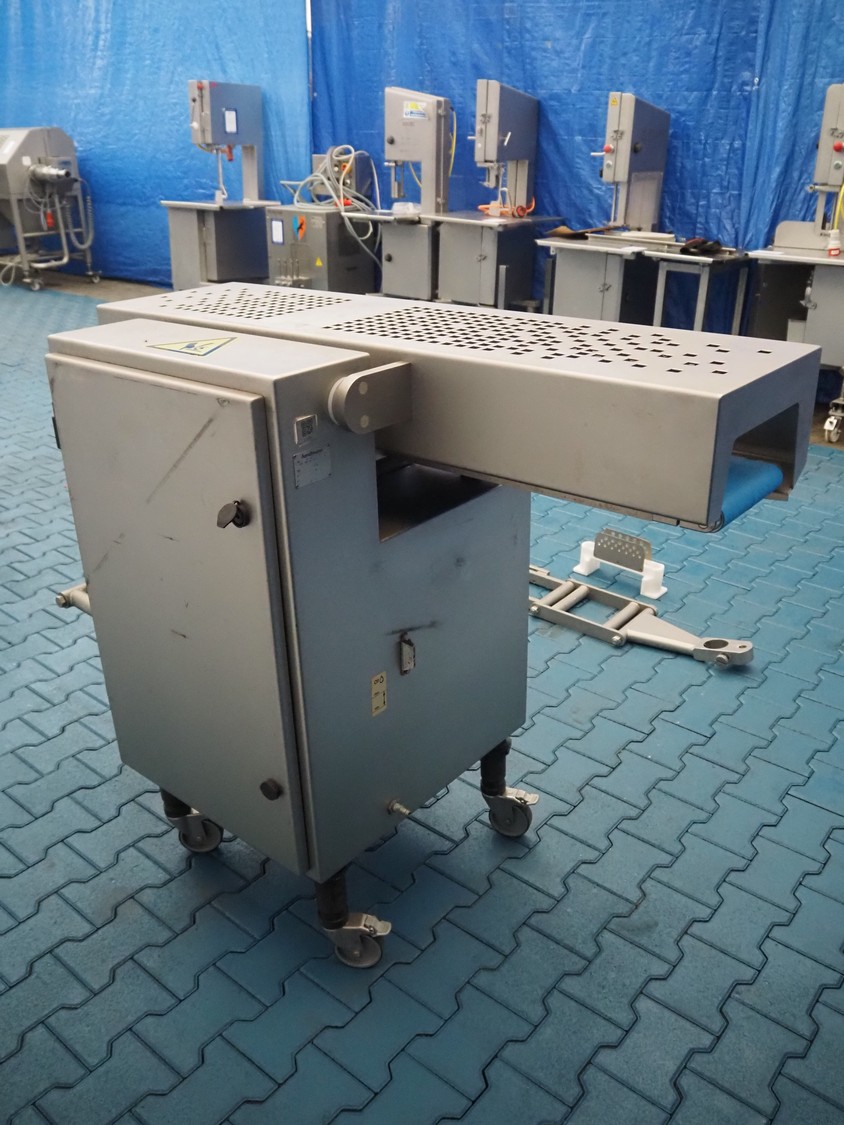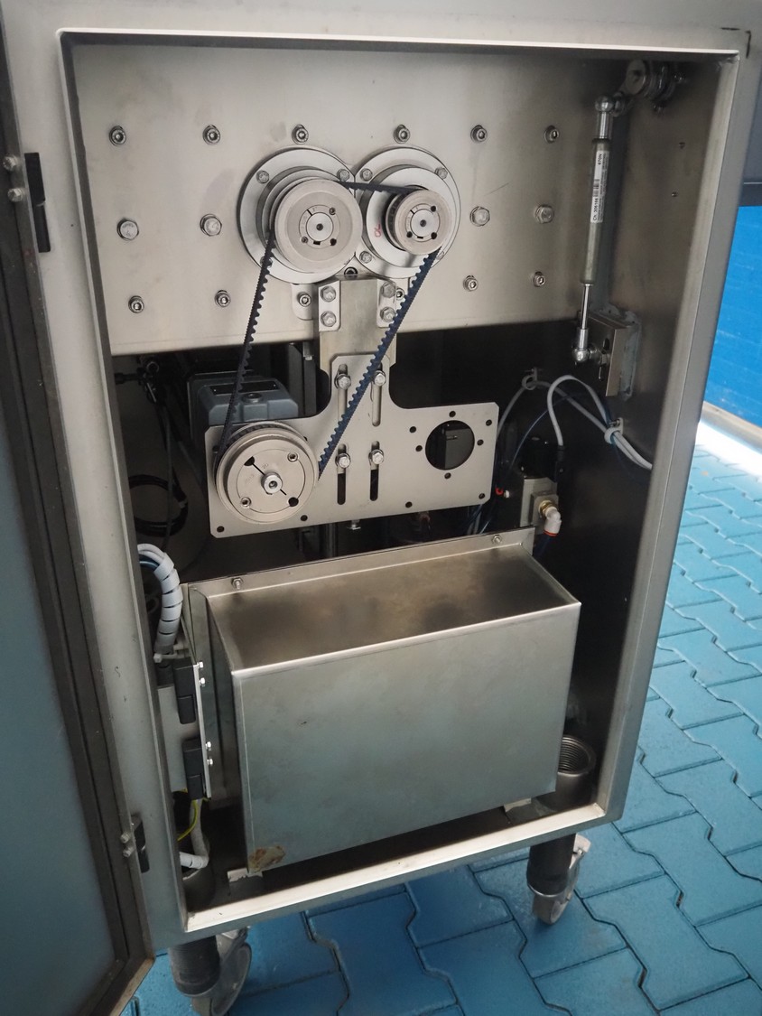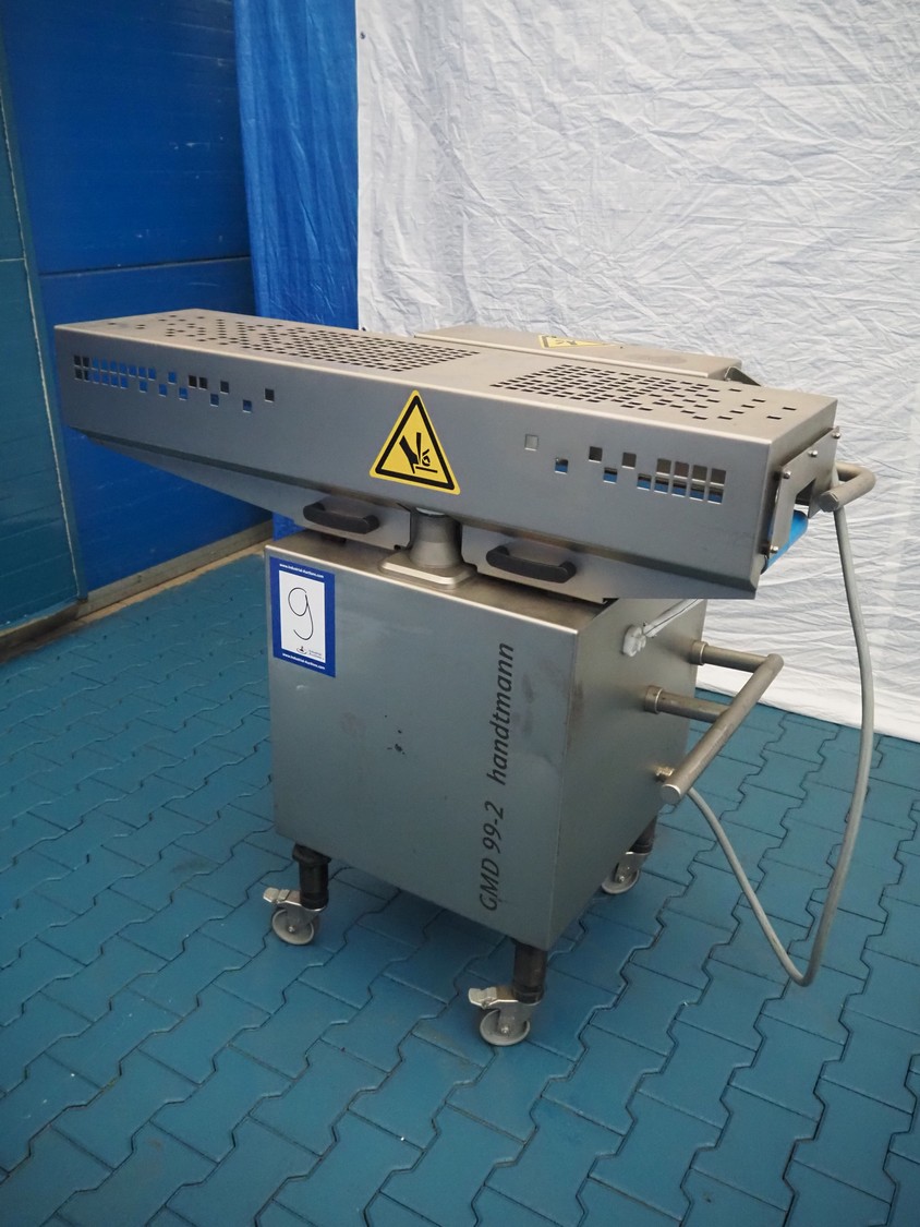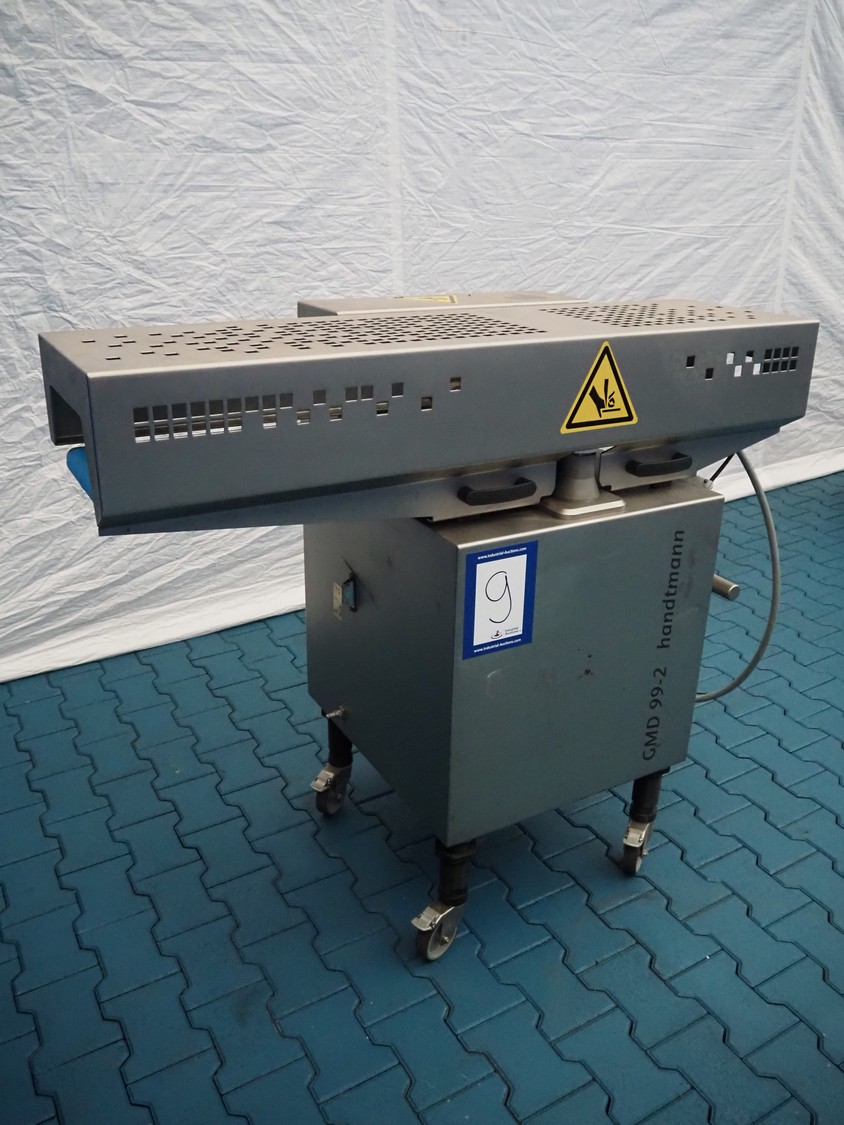 Handtmann mobile minced meat portioner, type: 99-2, number: 33909, year of construction: 2014, working width: 240 mm, plastic belt, belt width: 250 mm, total dimensions: 1380 mm x 700 mm x 1240 mm.