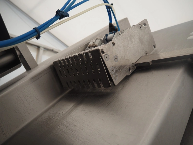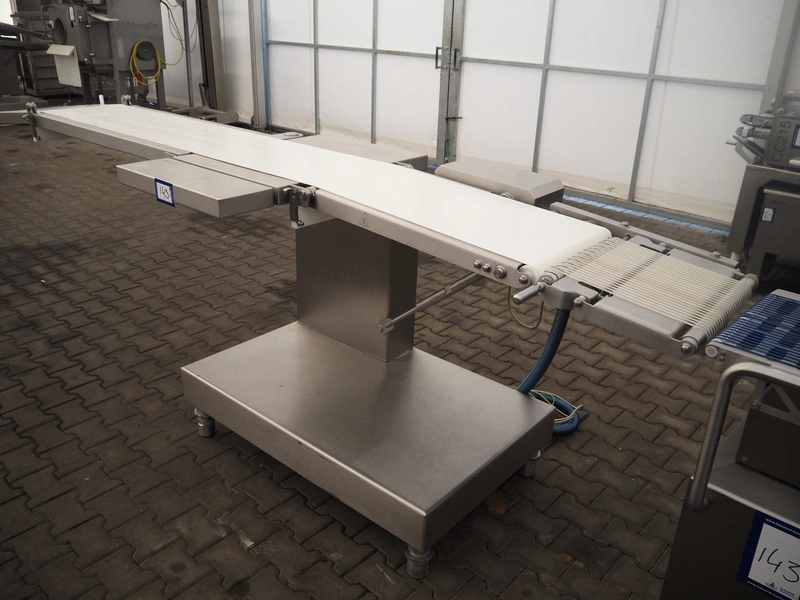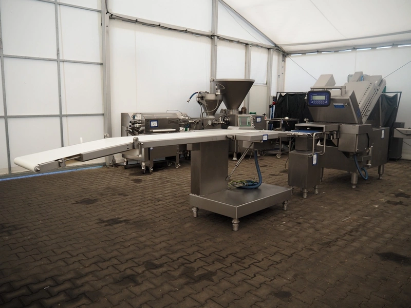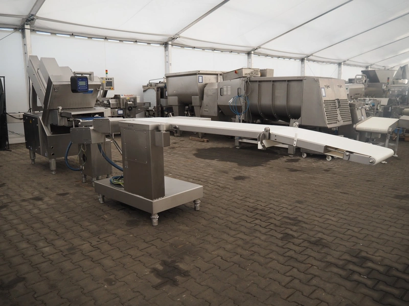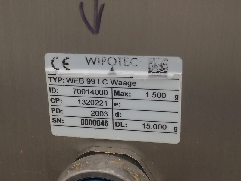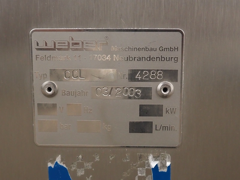 Weber slicer line, consisting of: Weber slicer, type slicer: CCS 402, number: 288, year of construction: 03 2003, 400 V, 50 Hz, 10 kW, plastic belt, belt width: 400 mm, Wipotec checkweigher, type: WEB 99 LC Waage, serial number: 0000046, year of construction: 2003, maximum weight: 1500 gram, plastic belt, belt width: 400 mm, Weber outfeed belt, type outfeed belt: CCL , number: 4288, year of construction: 03/2003, plastic belt, belt width: 400 mm, total dimensions slicer: 2400 mm x 1100 mm x 2100 mm, total dimensions checkweigher: 500 mm x 500 mm x 1100 mm and total dimensions outfeed belt: 3900 mm x 1000 mm x 1100 mm.