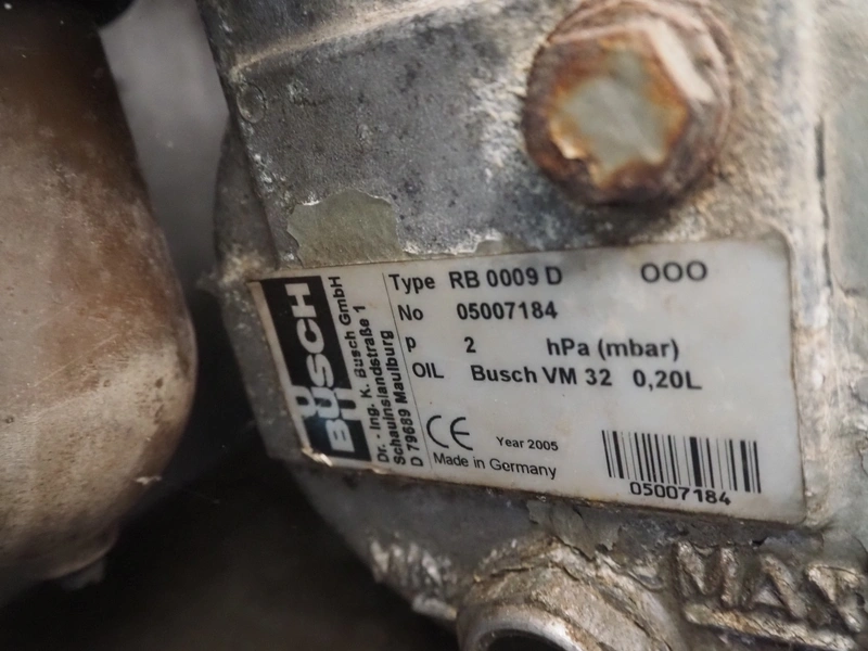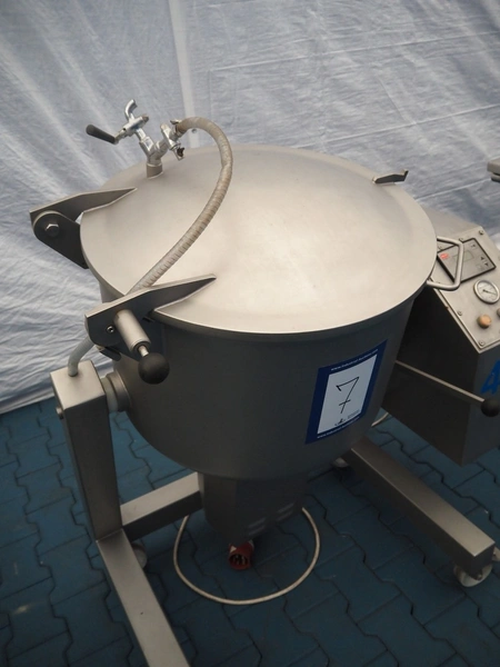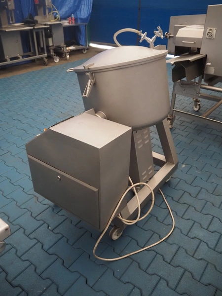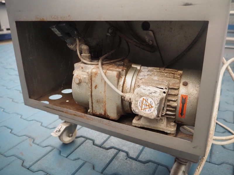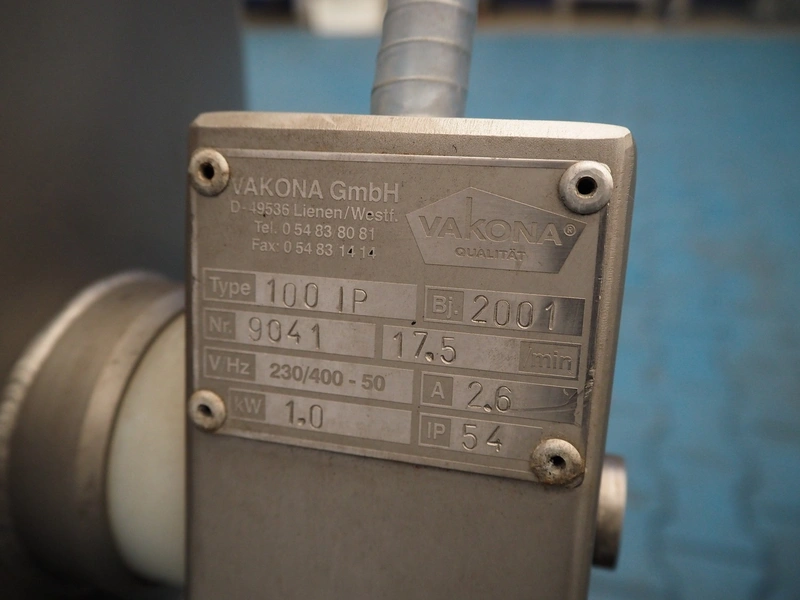 Vakona GmbH mobile vacuum tumbler, type: 100 IP, number: 9041, year of construction: 2001, 230/400 V, 50 Hz, 2.6 A, 1.0 kW, volume: 100 liter, Busch vacuum pump, type: RB 0009 D, dimensions: 1200 mm x 800 mm x 1300 mm. Without agitator.
