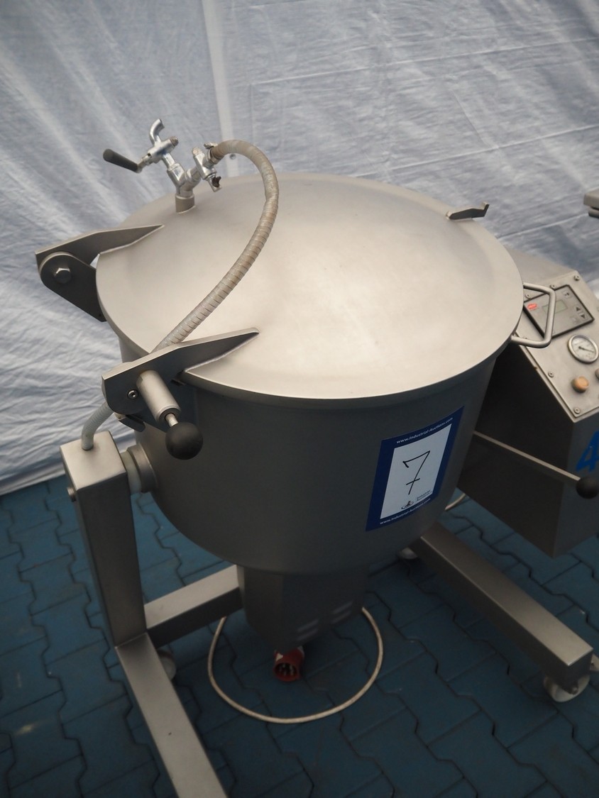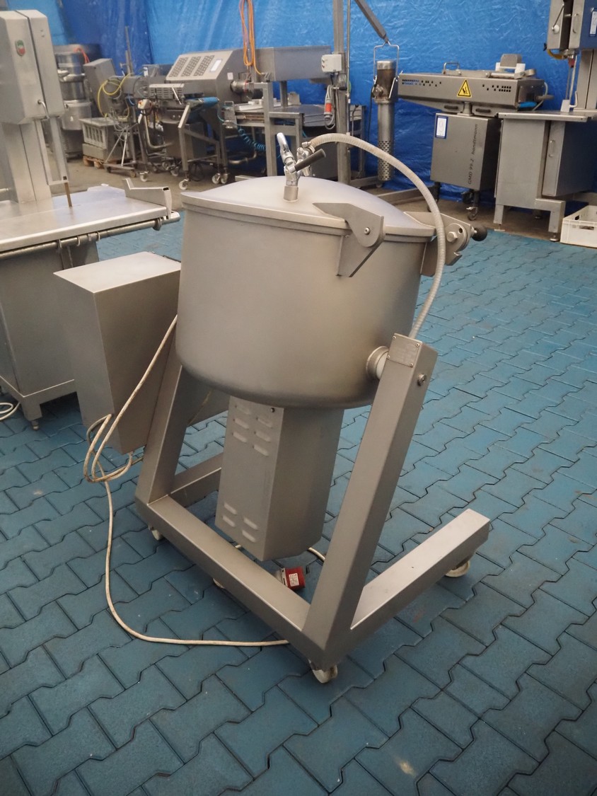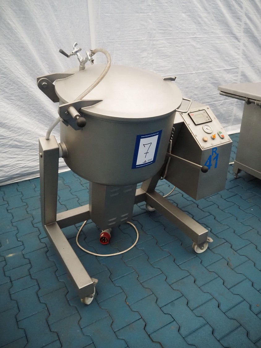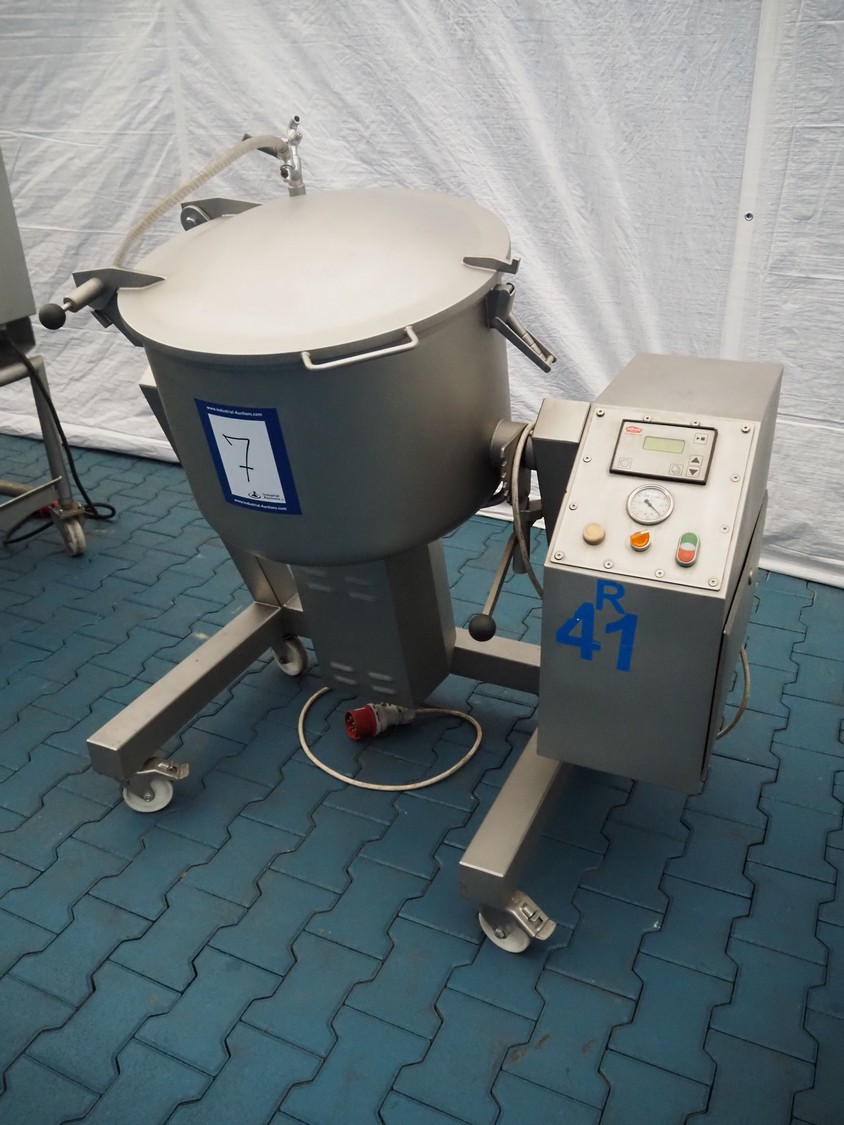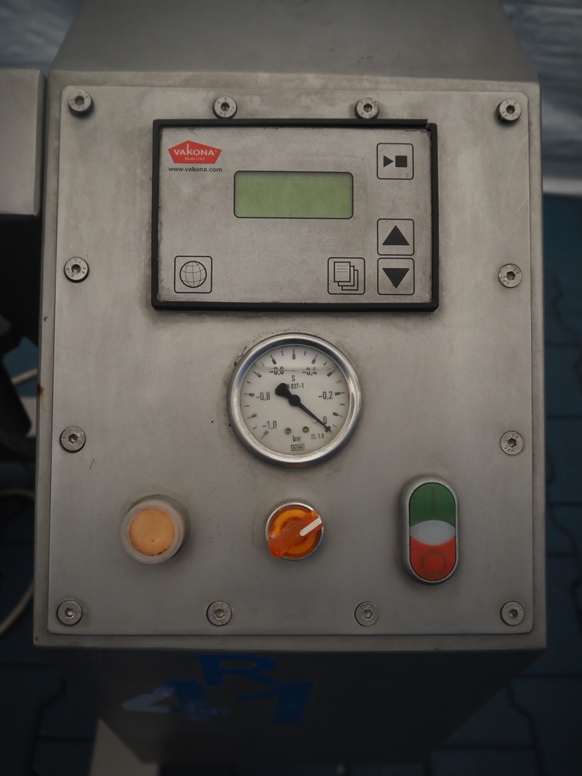 Vakona GmbH mobile vacuum tumbler, type: 100 IP, number: 9041, year of construction: 2001, 230/400 V, 50 Hz, 2.6 A, 1.0 kW, volume: 100 liter, Busch vacuum pump, type: RB 0009 D, dimensions: 1200 mm x 800 mm x 1300 mm. Without agitator.