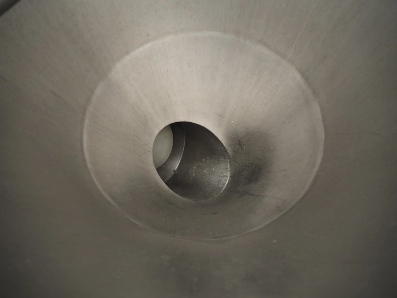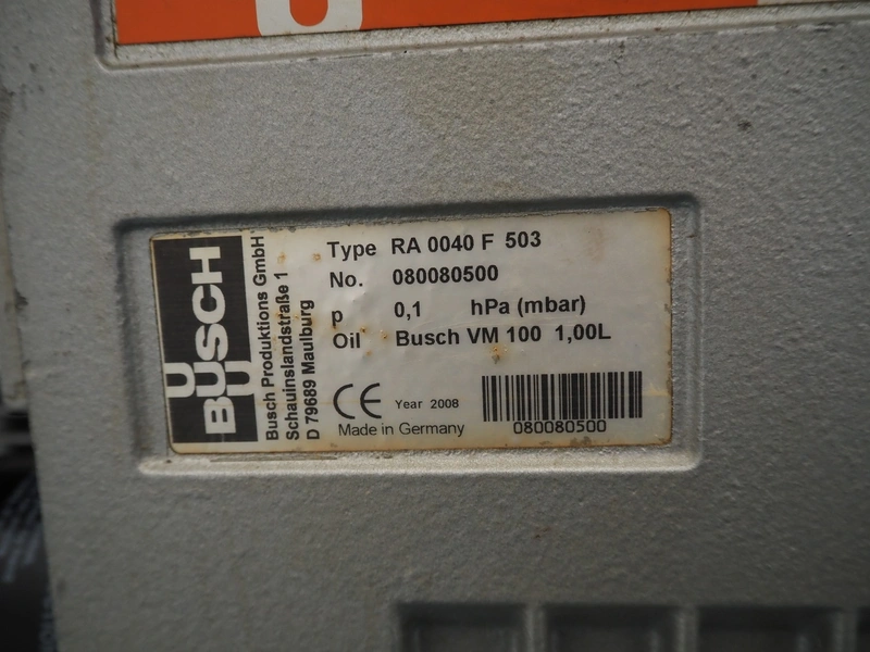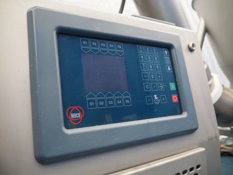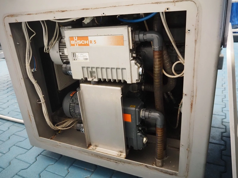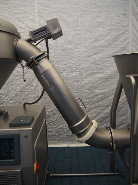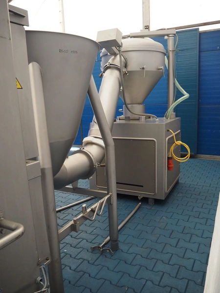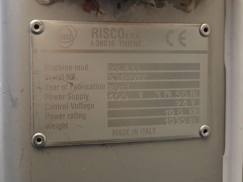 Risco S.P.A. high vacuum filling machine with infeed hopper, machine model: RS 613, serial number: S312017, year of construction: 2013, 400 V, 3 Ph, 50 Hz, 10.0 kW, weight: 1095 kg, dimensions vacuum filler: 1100 mm x 1600 mm x 2500 mm. Including infeed hopper, dimensions hopper: 2000 mm x 1700 mm x 1800 mm.