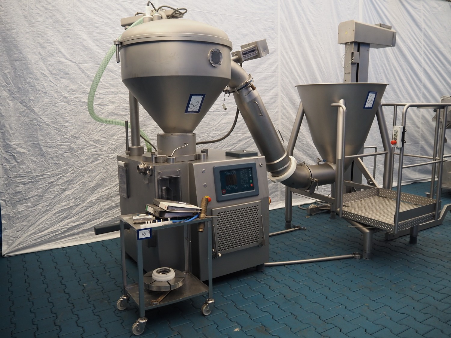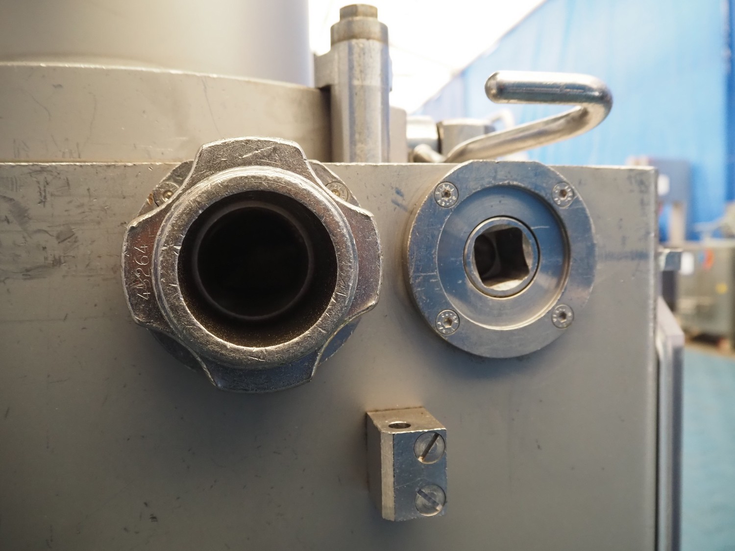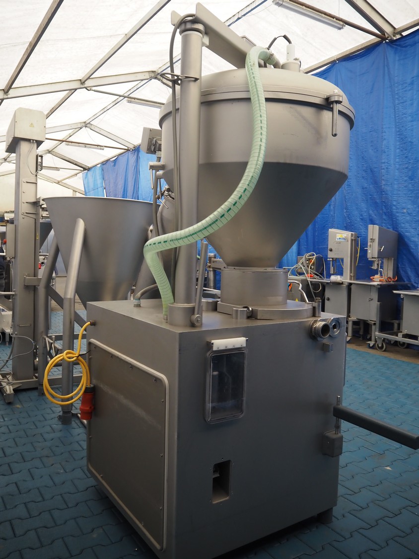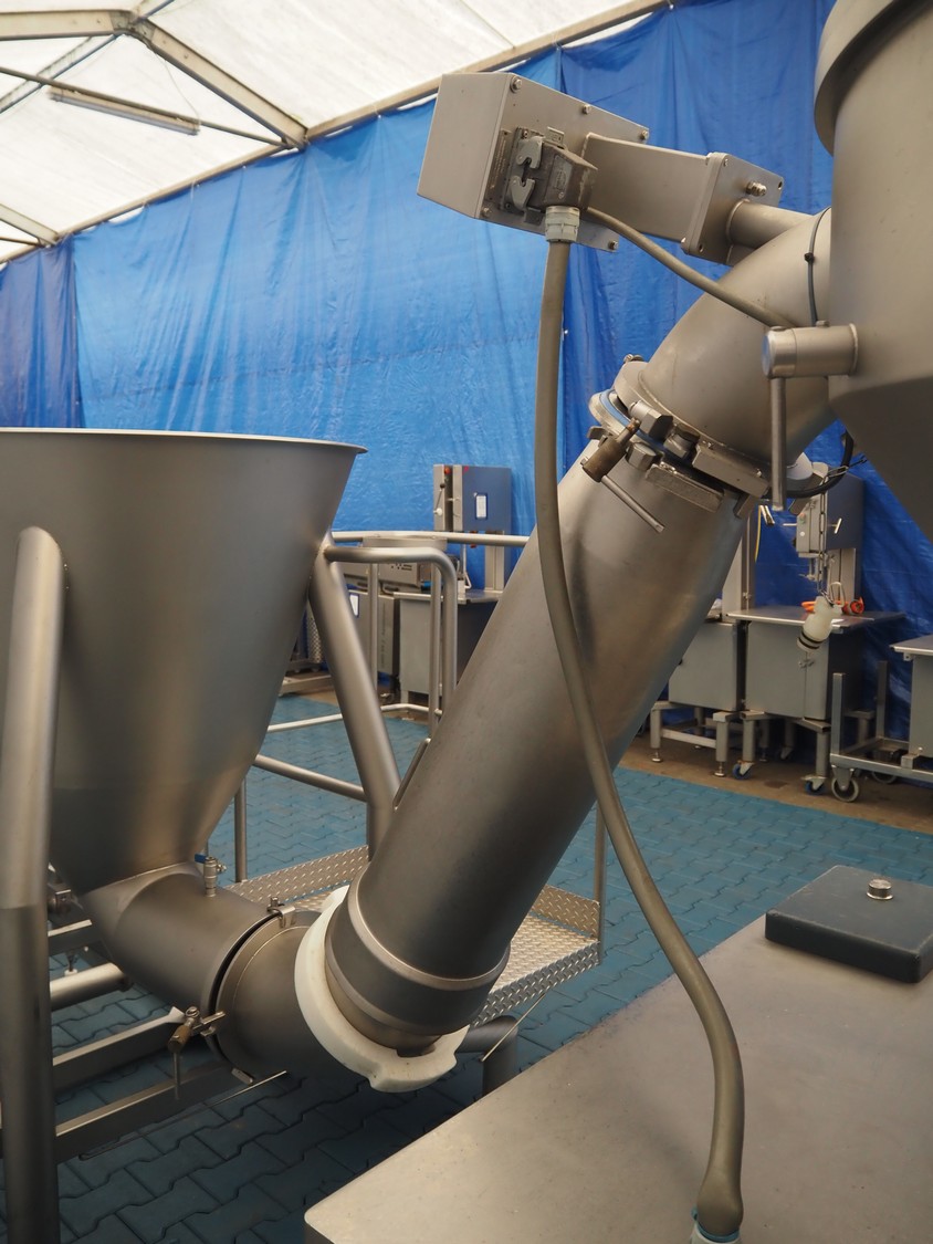 Risco S.P.A. high vacuum filling machine with infeed hopper, machine model: RS 613, serial number: S312017, year of construction: 2013, 400 V, 3 Ph, 50 Hz, 10.0 kW, weight: 1095 kg, dimensions vacuum filler: 1100 mm x 1600 mm x 2500 mm. Including infeed hopper, dimensions hopper: 2000 mm x 1700 mm x 1800 mm.