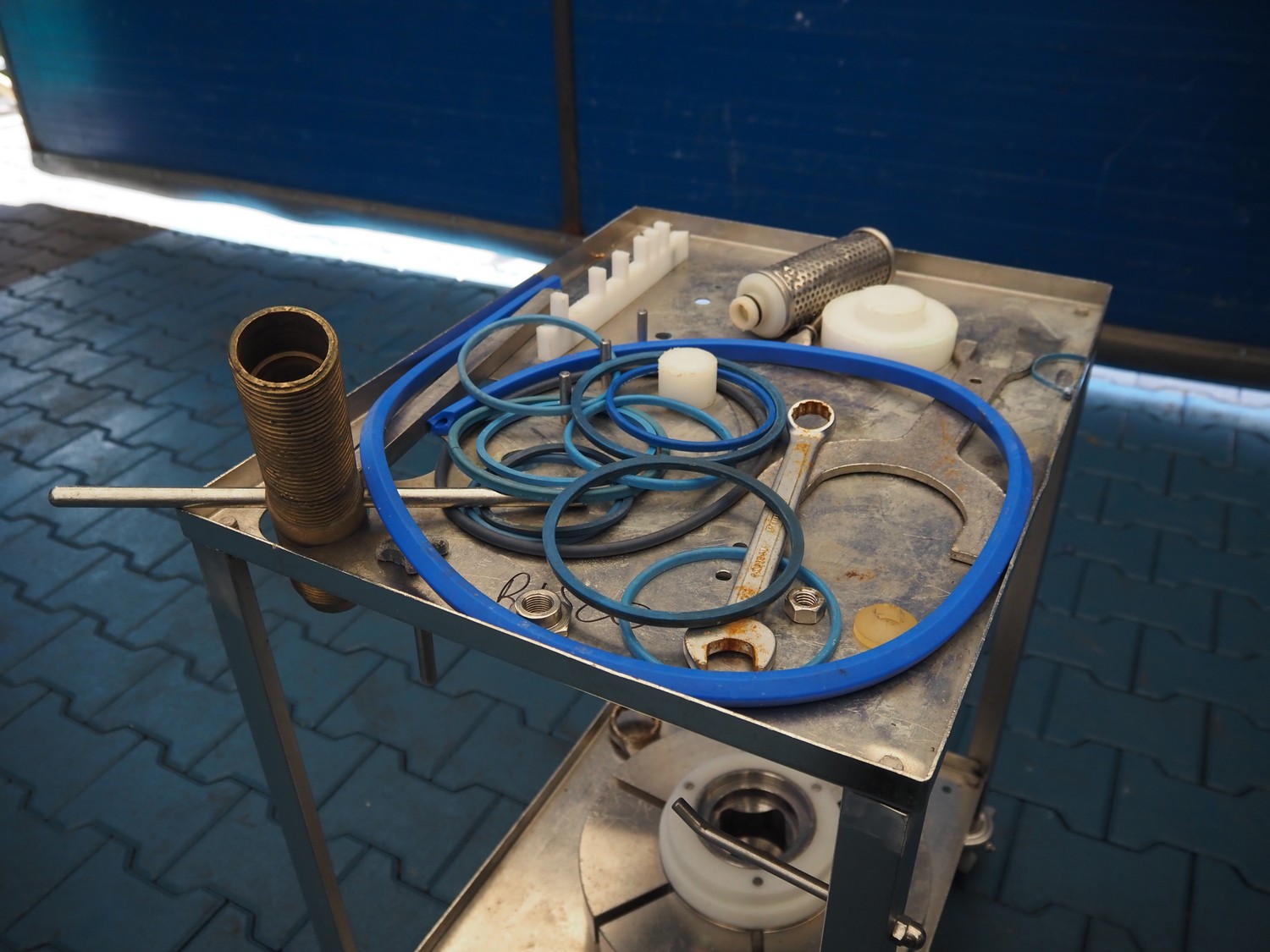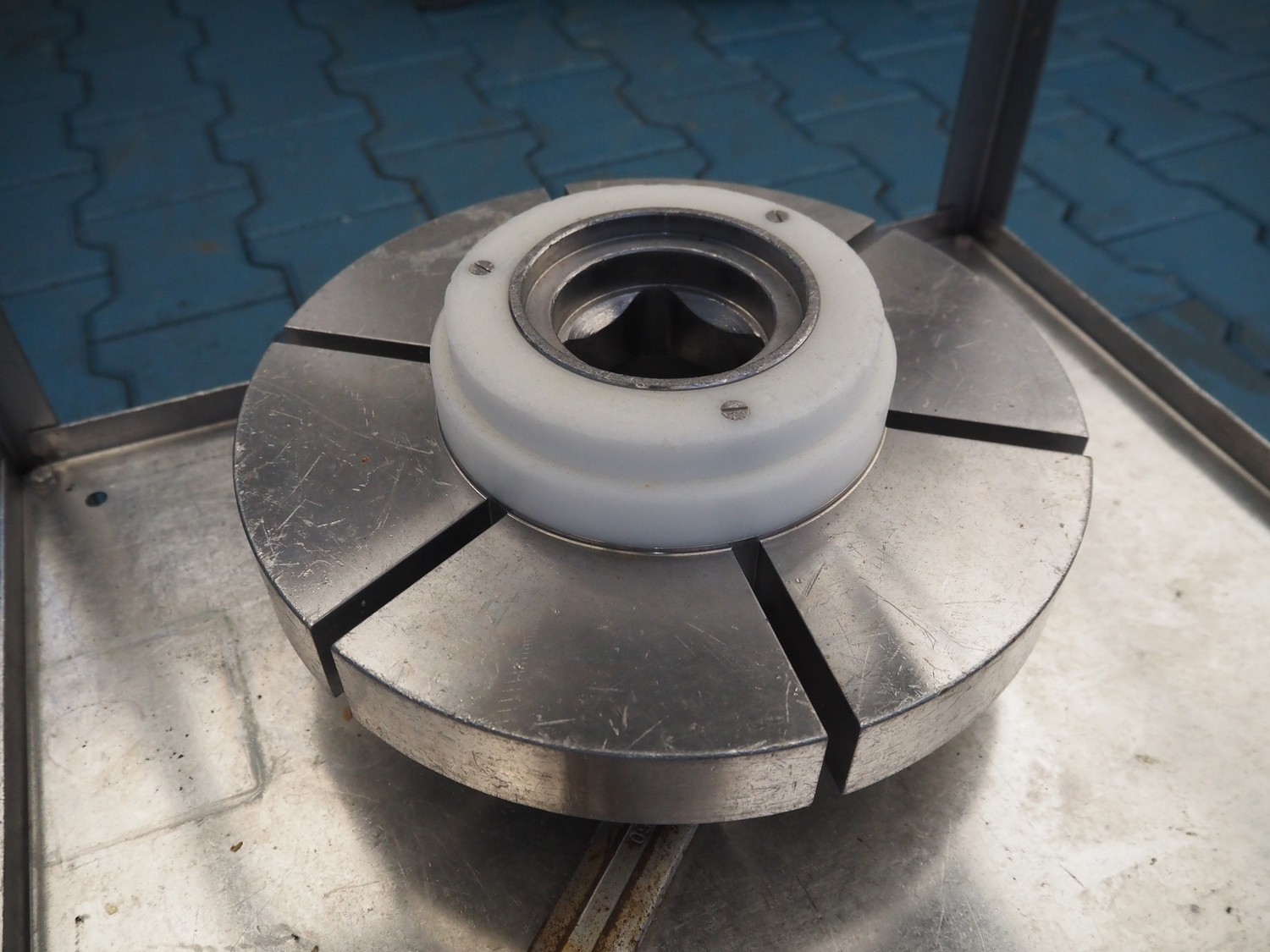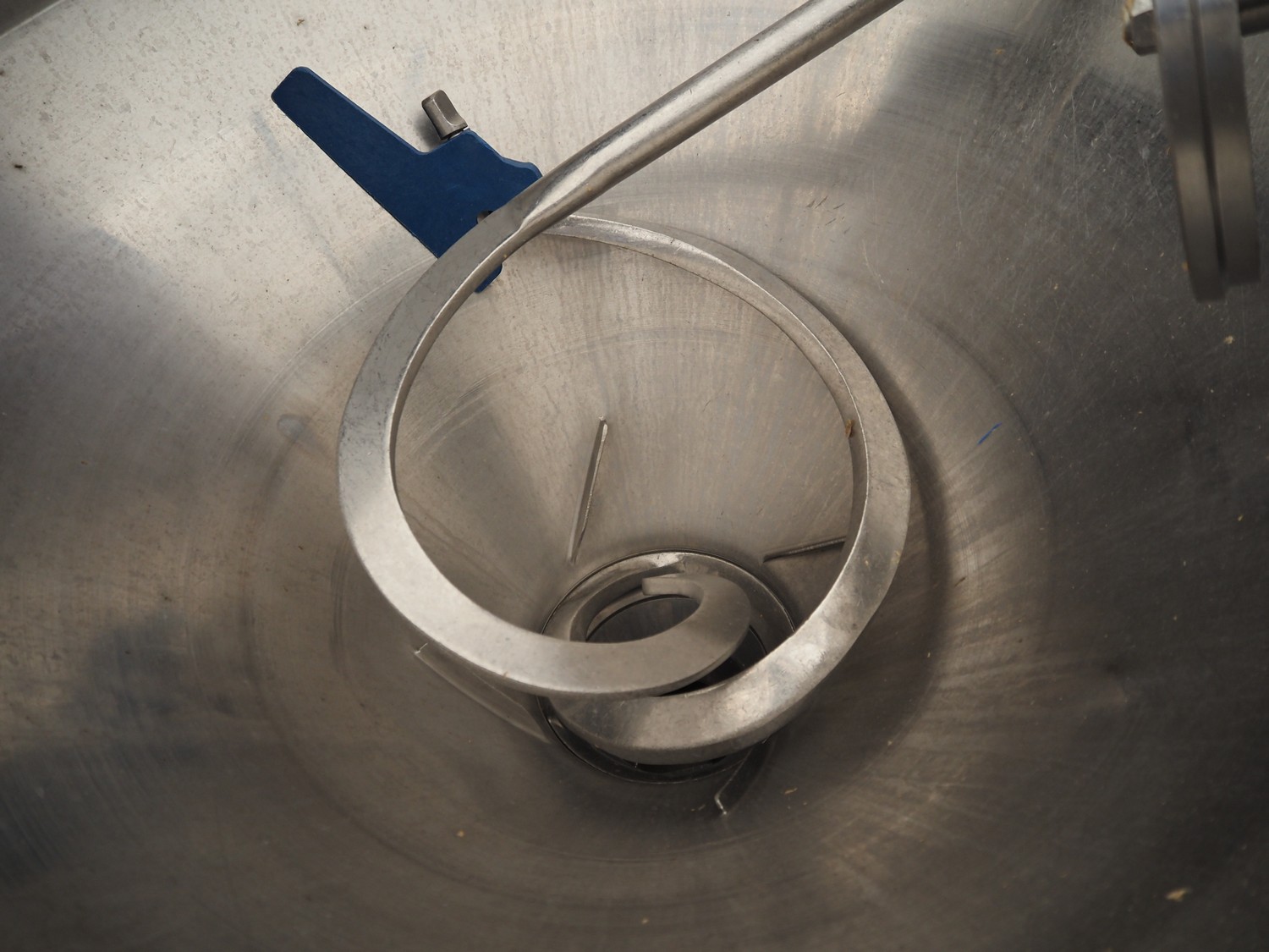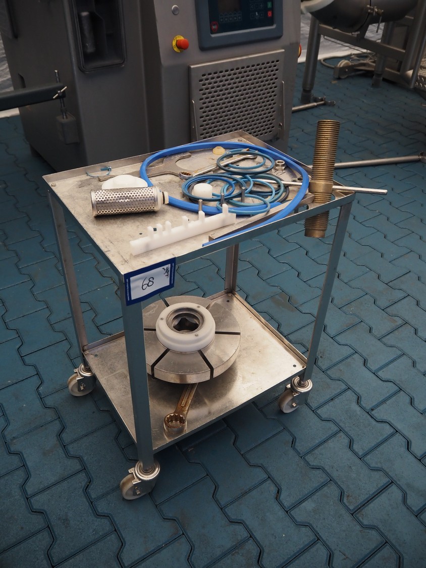 Risco S.P.A. high vacuum filling machine with infeed hopper, machine model: RS 613, serial number: S312017, year of construction: 2013, 400 V, 3 Ph, 50 Hz, 10.0 kW, weight: 1095 kg, dimensions vacuum filler: 1100 mm x 1600 mm x 2500 mm. Including infeed hopper, dimensions hopper: 2000 mm x 1700 mm x 1800 mm.