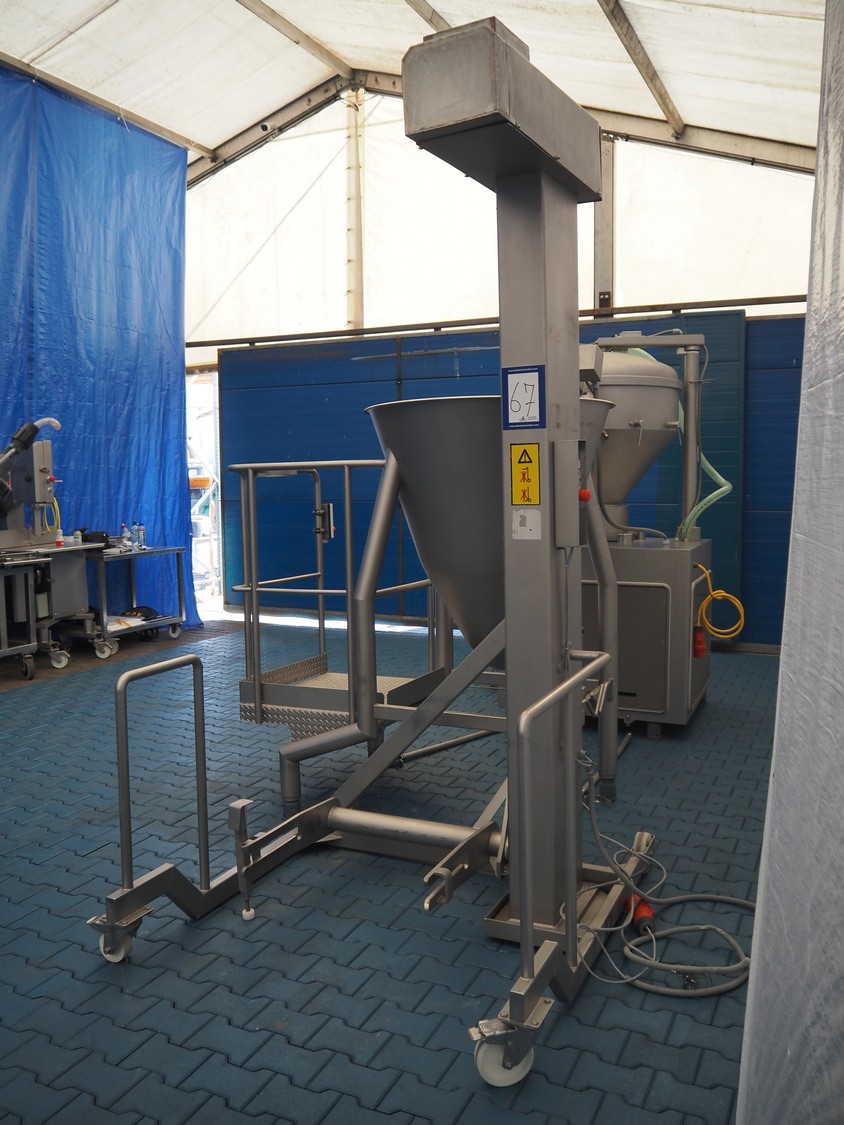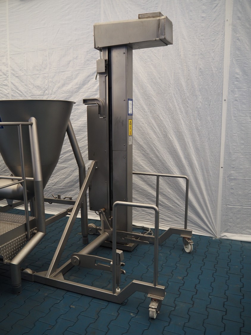 Bonner mobile lifter for 200 liter meat bins, machine number: 03 12 312 007, elevating height: 1830 mm, total dimensions: 1400 mm x 1500 mm x 2700 mm.