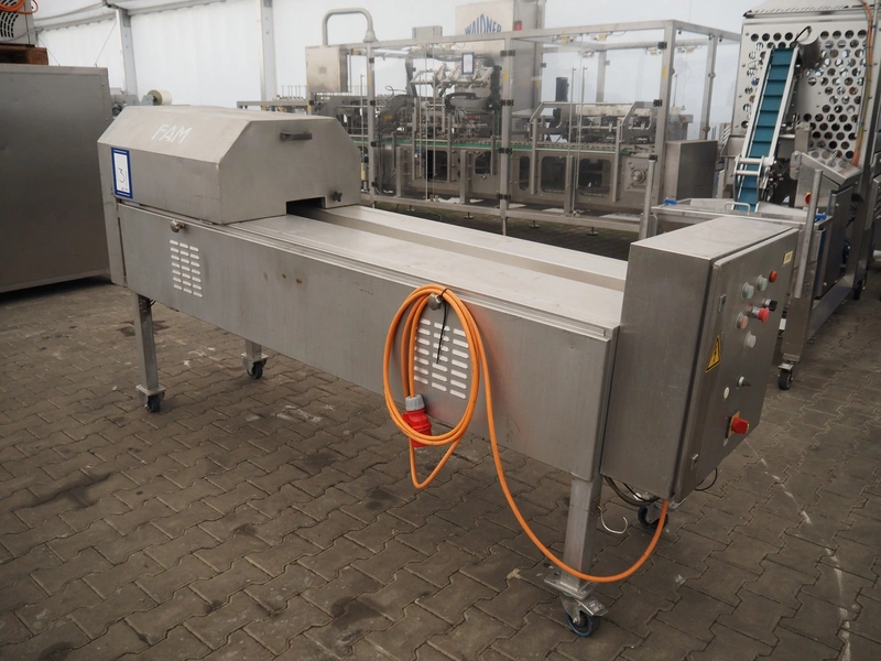 FAM horizontal vegetable slicer, type: TS-1D, serial number: 5947, year of construction: 2004, 400 V, 3 Ph, 50 Hz, 3.5 kW, weight: 350 kg, V-shaped belt, belt width: (2x) 90 mm, total dimensions: 3000 mm x 780 mm x 1450 mm.