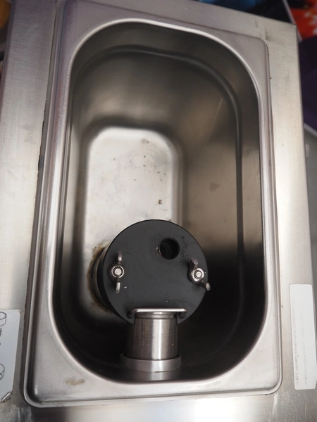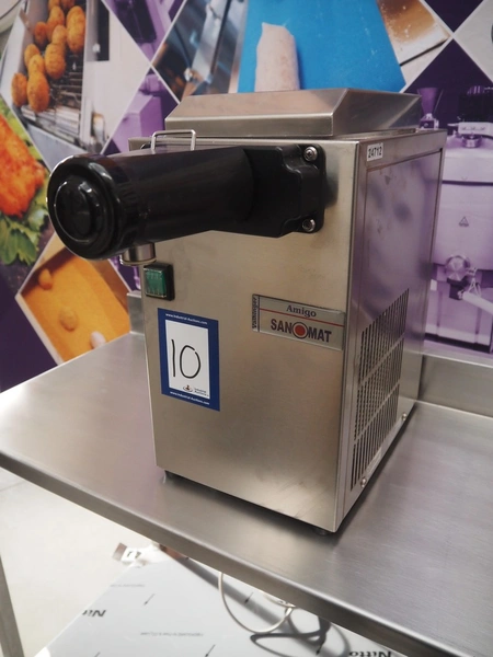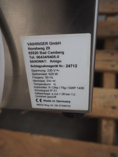 Sanomat whipped cream machine, model: Amigo, serial number: 24712, 230 V, 50 Hz, 620 W, refrigerant: R134a/75g, dimensions: 500 mm x 230 mm x 420 mm.