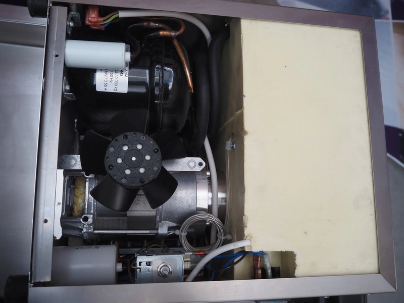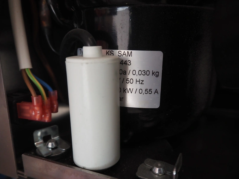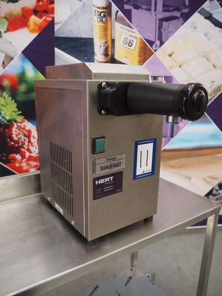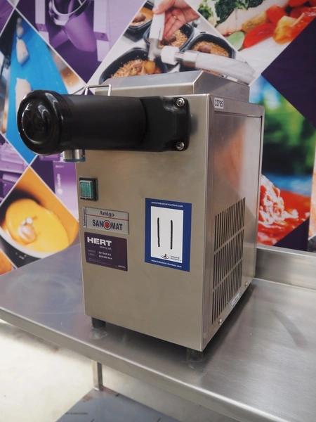 Sanomat whipped cream machine, model: Amigo, serial number: 33795, 230 V, 50 Hz, 850 W, refrigerant: R600a/30g, dimensions: 500 mm x 230 mm x 420 mm.