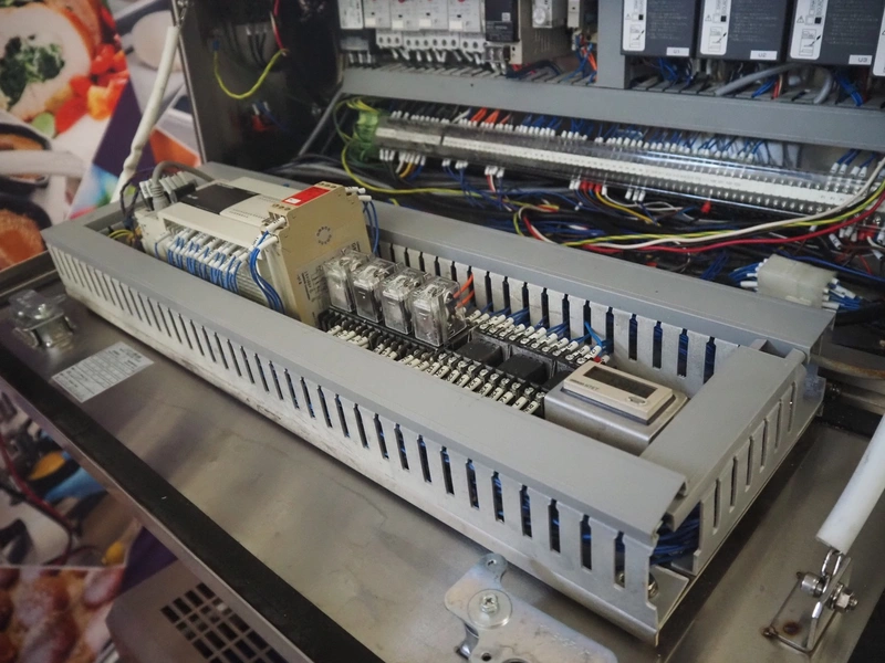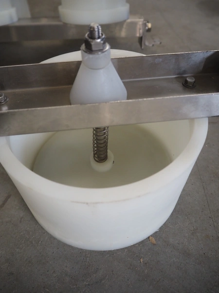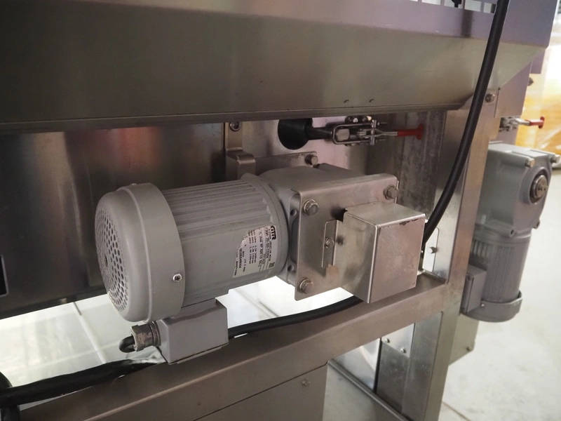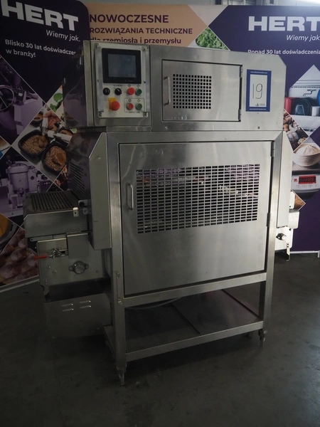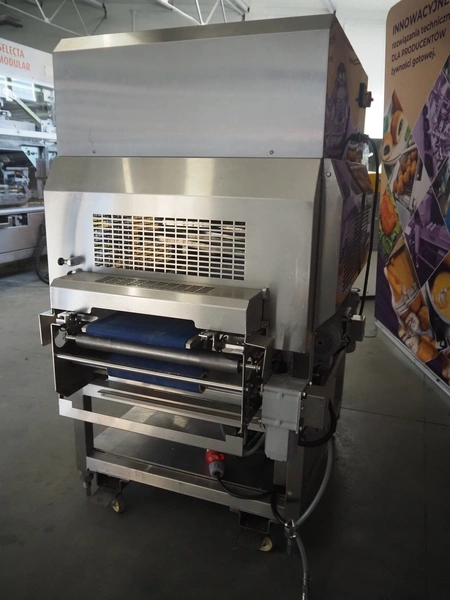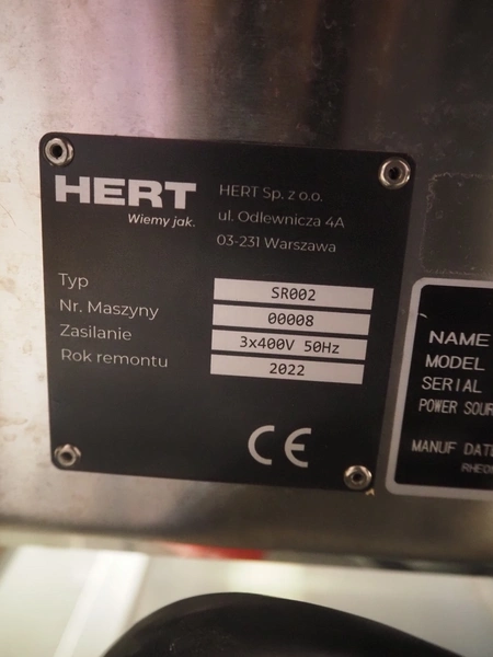 Rheon mobile 2 rows cup rounder, model: SR002, serial number: 00008, year of construction: 2010, 380 V, 3 Ph, 50 Hz, 7.64 A, 2267 W, plastic belt, belt width: 500 mm, 300 mm, clearance: 320 mm x 45 mm, dimensions dye: ø 85 mm, ø 155 mm, 175 mm x 175 mm, total dimensions: 1560 mm x 1020 mm x 1650 mm.