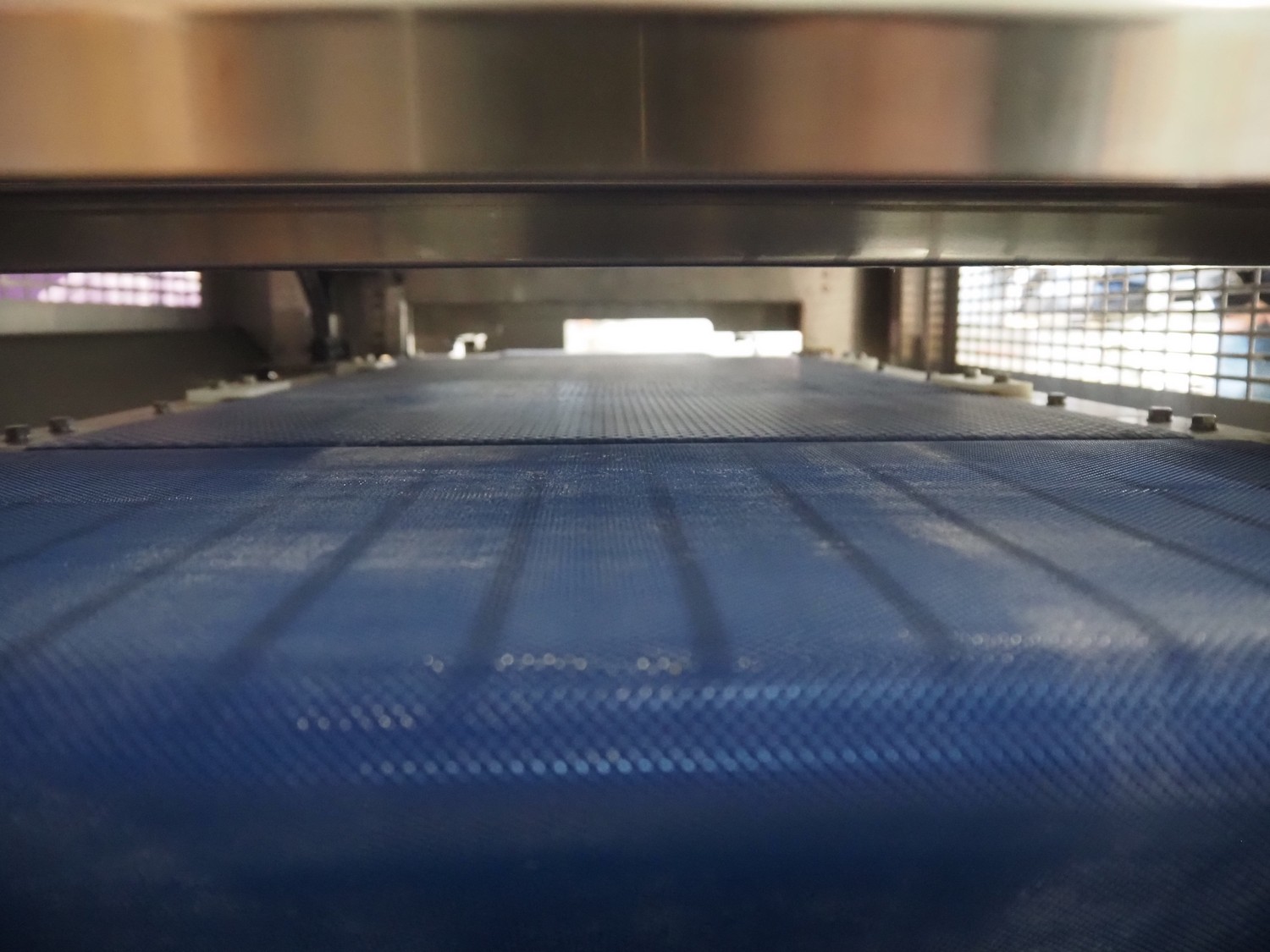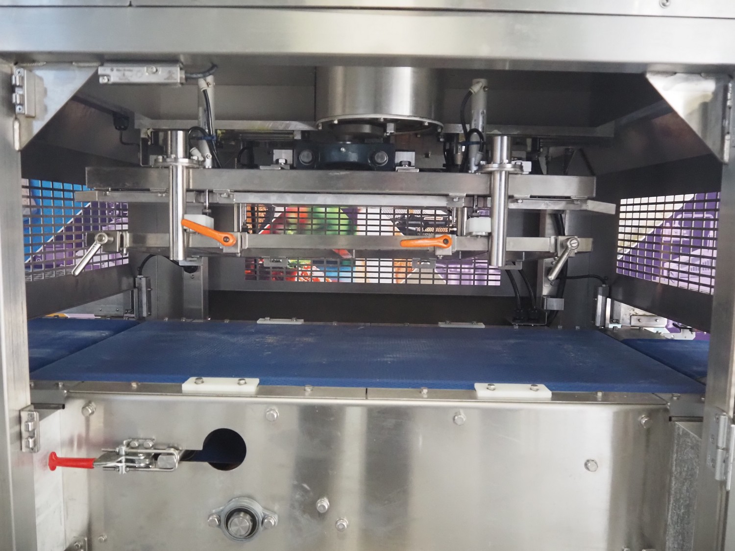 Rheon mobile 2 rows cup rounder, model: SR002, serial number: 00008, year of construction: 2010, 380 V, 3 Ph, 50 Hz, 7.64 A, 2267 W, plastic belt, belt width: 500 mm, 300 mm, clearance: 320 mm x 45 mm, dimensions dye: ø 85 mm, ø 155 mm, 175 mm x 175 mm, total dimensions: 1560 mm x 1020 mm x 1650 mm.