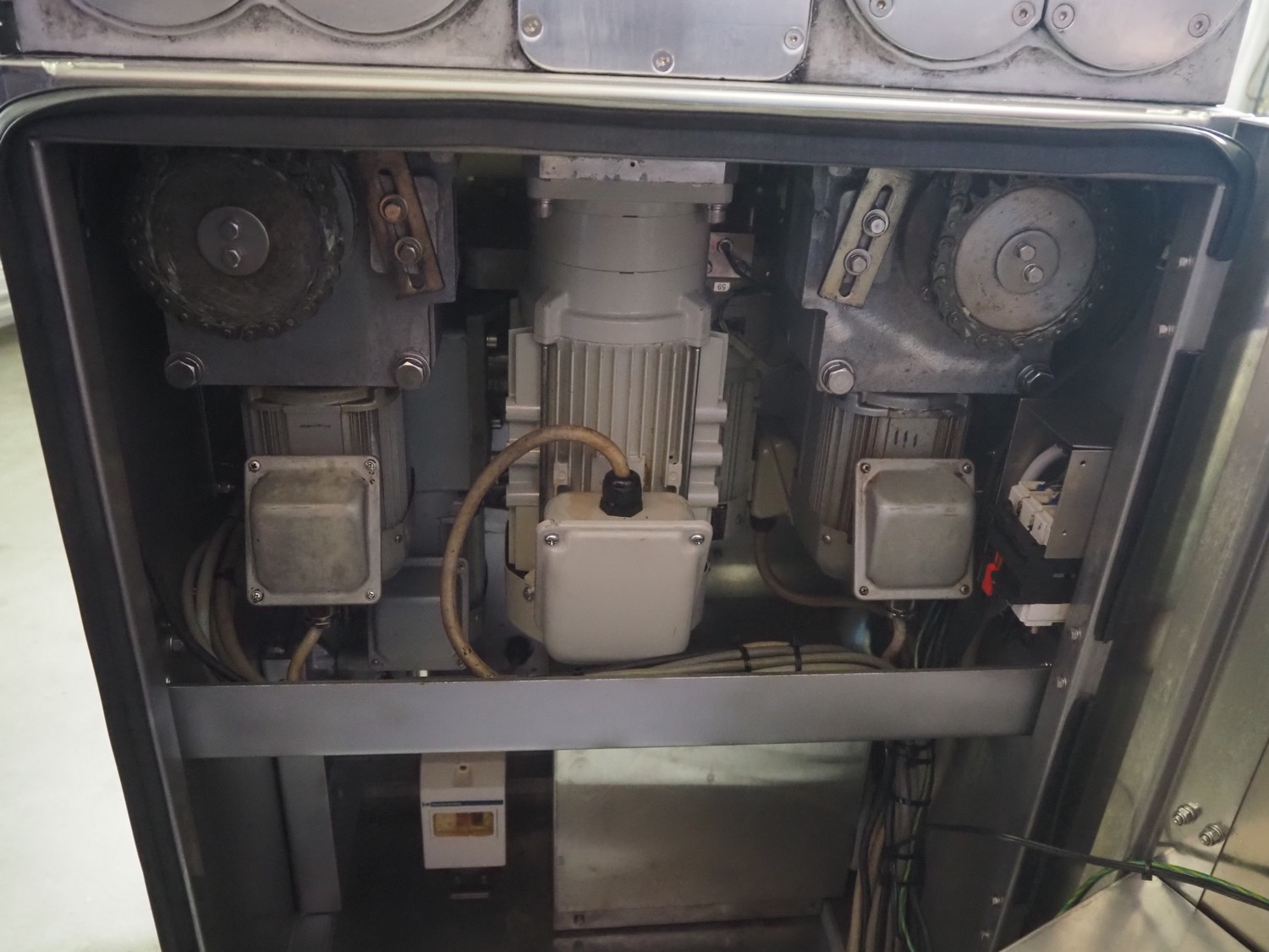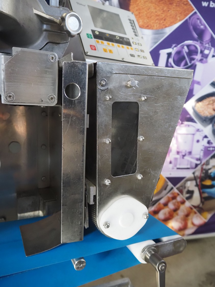 Rheon mobile encrusting machine, name: Cornucopia, model: KN550, serial number: 251, year of construction: 2008, year of renovation: 2024, 380 V, 3 Ph, 50/60 Hz, 8.2 A, 3.2 kW, plastic belt, belt width: 160 mm, total dimensions: 1800 mm x 950 mm x 1600 mm.