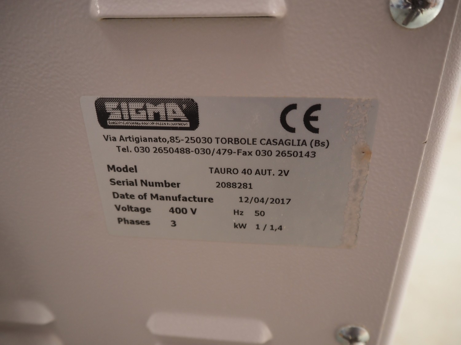 Sigma bowl mixer, model: TAURO 40 AUT. 2V, serial number: 2088281, year of construction: 2017, 400 V, 3 Ph, 50 Hz, 1/1.4 kW, inside dimensions bowl: ø 500 mm x 300 mm, total dimensions: 780 mm x 530 mm x 840 mm.