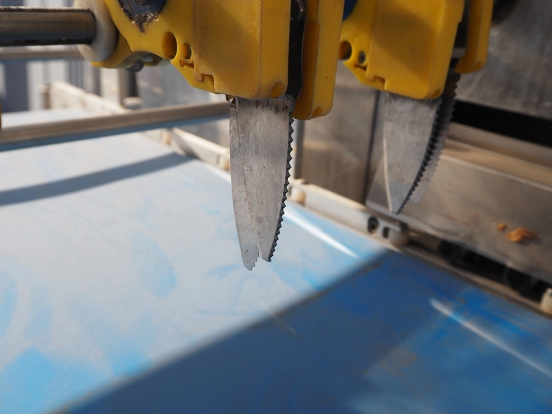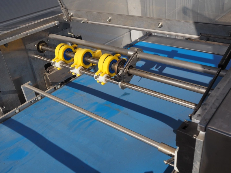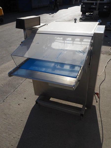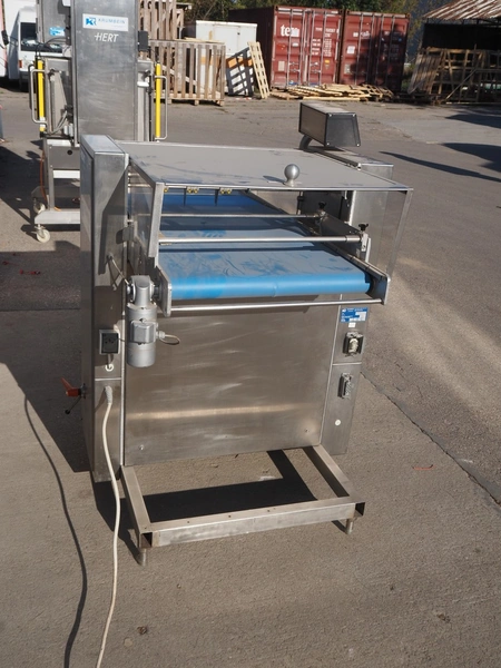 Krumbein cake cutting machine, type: KSSM-V2.0D, serial number: D01J, year of construction: 1996, 400 V, 3 Ph, 50/60 Hz, 10/3,5 A, 3 knifes, plastic belt, belt width: 600 mm, clearance: 700 mm x 130 mm, total dimensions: 1400 mm x 1040 mm x 1340 mm.
