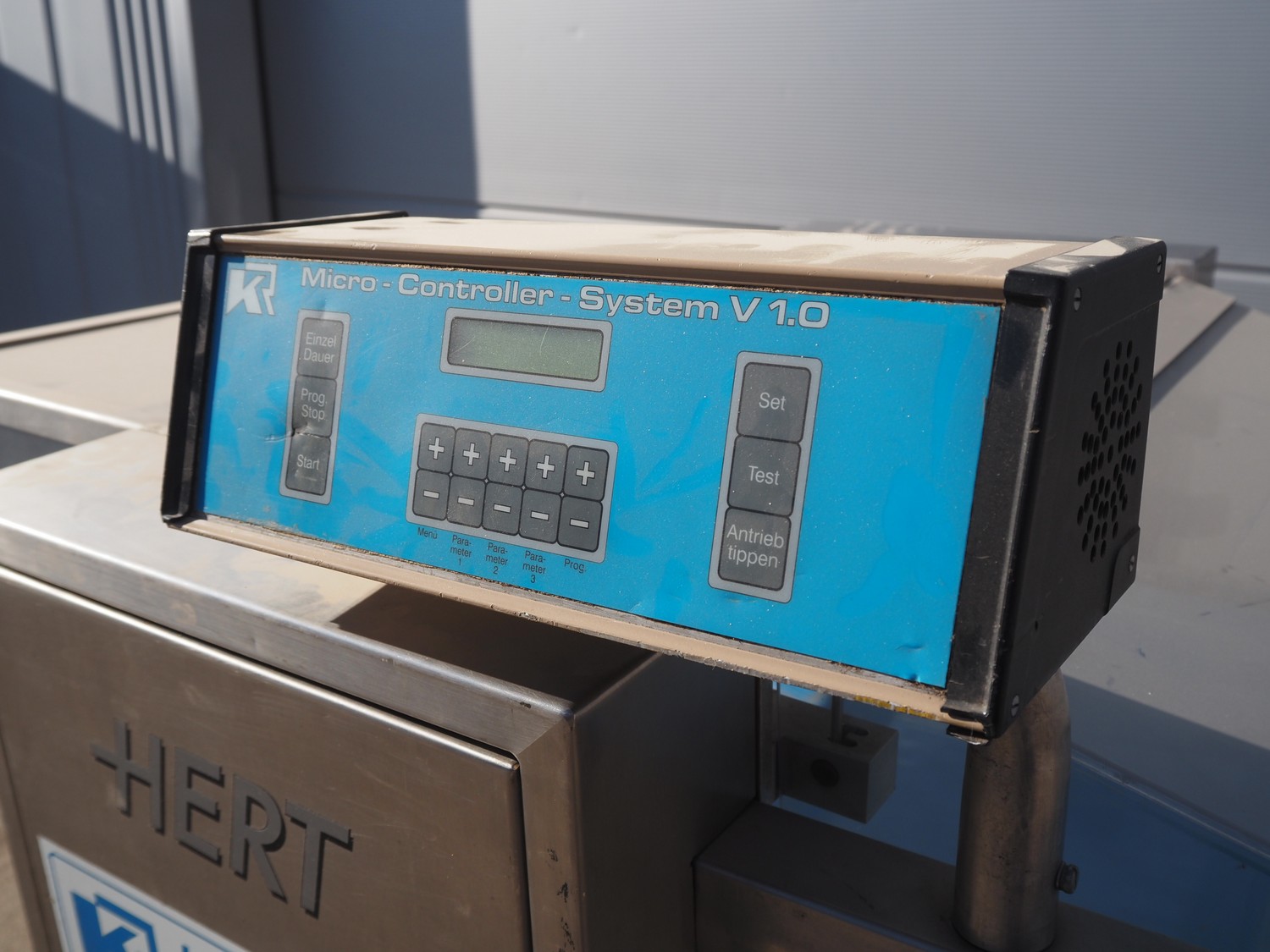 Krumbein cake cutting machine, type: KSSM-V2.0D, serial number: D01J, year of construction: 1996, 400 V, 3 Ph, 50/60 Hz, 10/3,5 A, 3 knifes, plastic belt, belt width: 600 mm, clearance: 700 mm x 130 mm, total dimensions: 1400 mm x 1040 mm x 1340 mm.