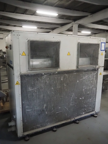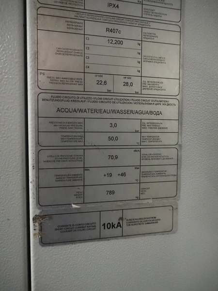 M.T.A. S.p.A. water chiller, model: ON211, number: 2200208255, year of construction: 2012, 400 V, 3 Ph, 50 Hz, machine weight: 12.200 kg, minimum temperature: +19°C, maximum temperature: +46°C, dimensions: 4630 mm x 1300 mm x 1900 mm. Damaged.