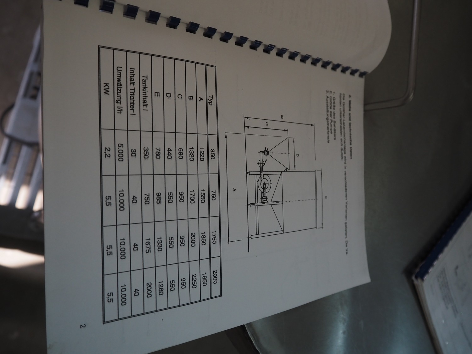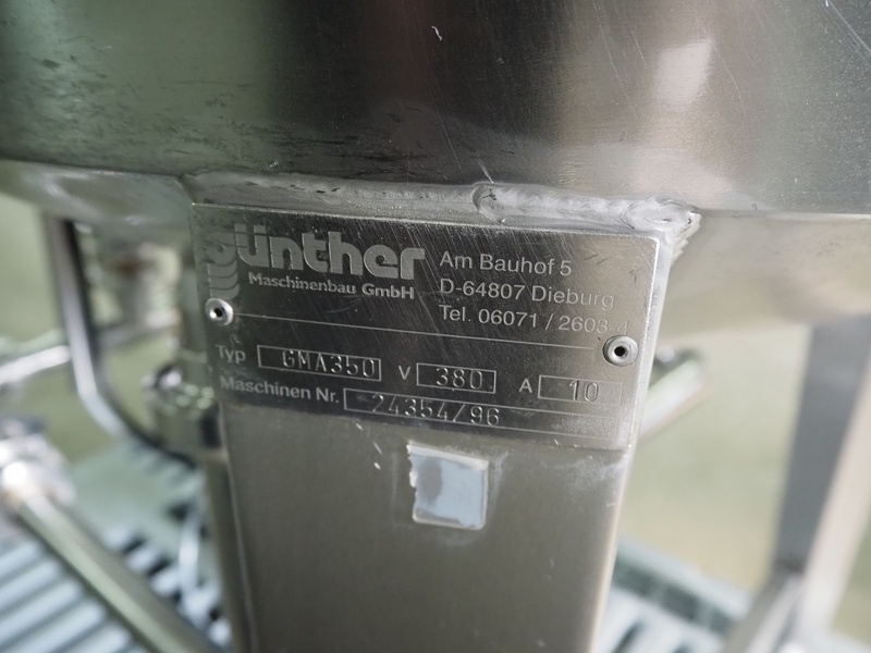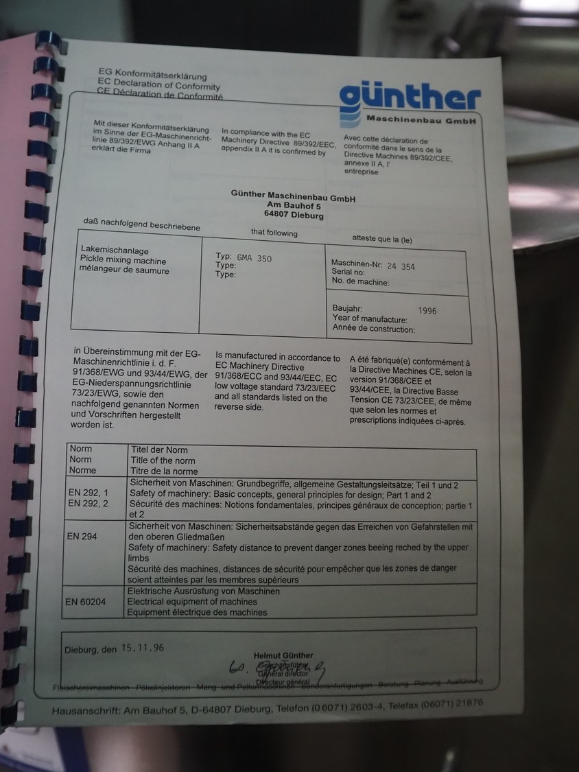 Günther Maschinenbau GmbH brine tank, type: GMA350, machine number: 24354/96, 380 V, 10 A, volume: 350 liter, dimensions: 1260 mm x 830 mm x 1330 mm.