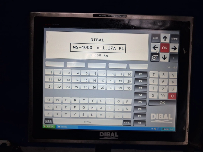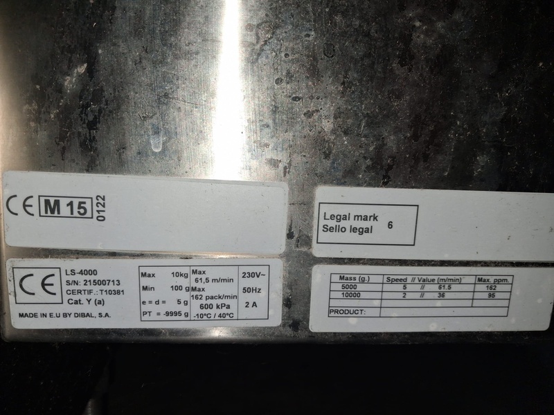 Dibal weighing and labelling machine, type: LS-4000, serial number: 21500713, 50 Hz, 230 V, 2 A, weighing range: 100 g / 10 kg, e = d = 5 g, capacity: maximum 162 pack/min, dimensions: 2500 mm x 600 mm x 1750 mm. Lot located in Sławogóra (PL), viewing and pick up in consultation with Industrial Auctions B.V.