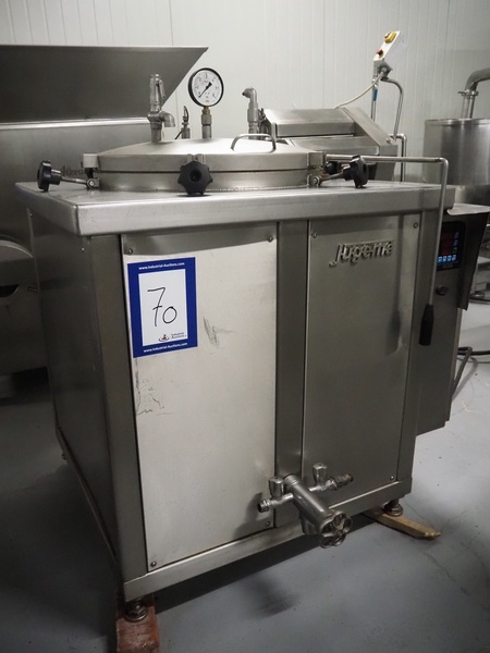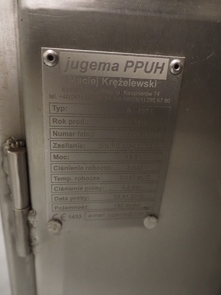 Jugema PPUH autoclave, type: A-150 E, number: 353/211/10, year of construction: 2010, 400/230 V, 3 Ph, 13.5 kW, 3 bar, volume: 150 liter, dimensions: 1150 mm x 1000 mm x 1280 mm.
