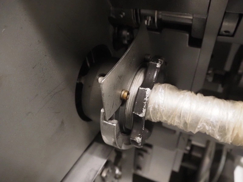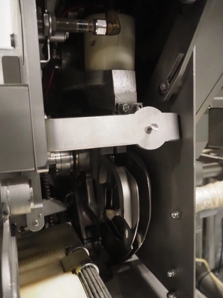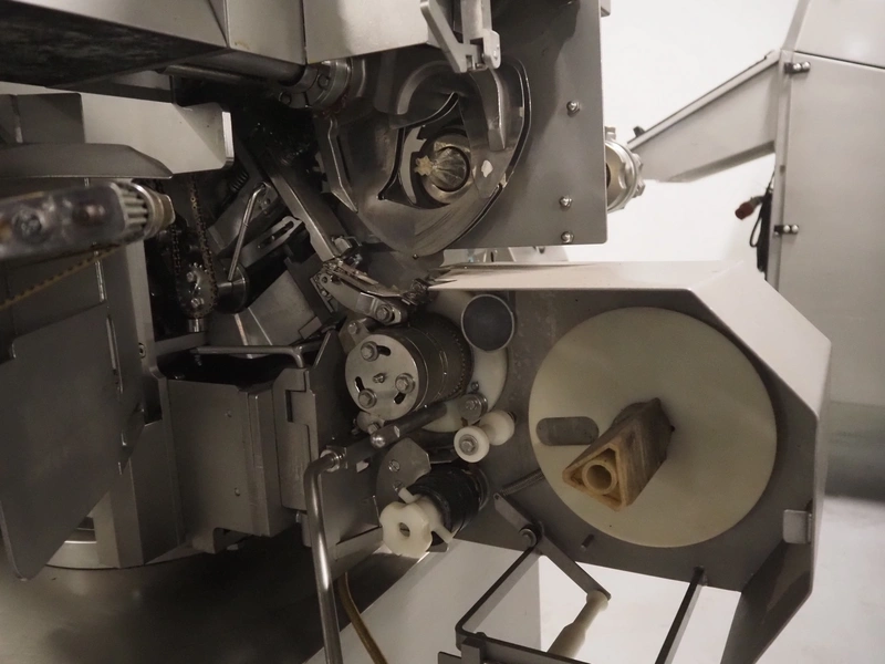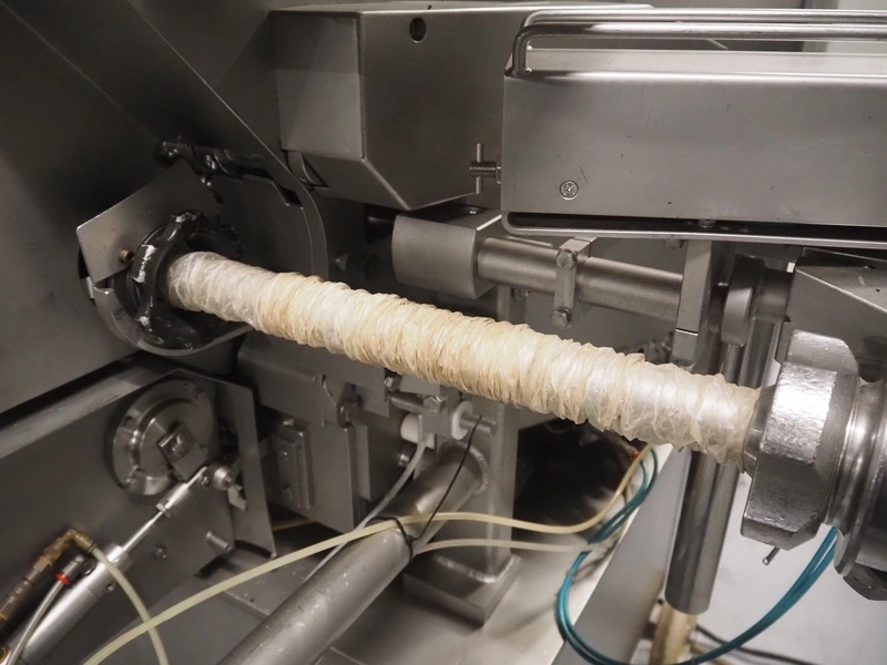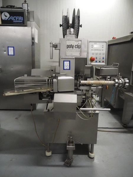Poly-clip System GmbH & Co. KG mobile automatic double-clipper, type: FCA 3430-18, number: 142, year of construction: 2005, 400 V, 3 Ph, 50/60 Hz, 6 A, 40 kW, 5-2 bar, plastic belt, belt width: 75 mm, diameter pipe: 60 mm, total dimensions: 1440 mm x 1170 mm x 1920 mm.