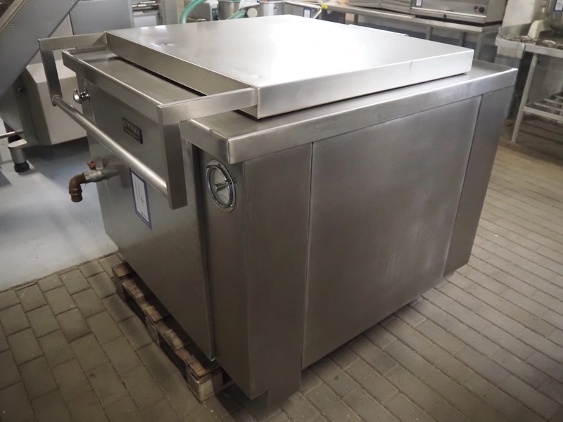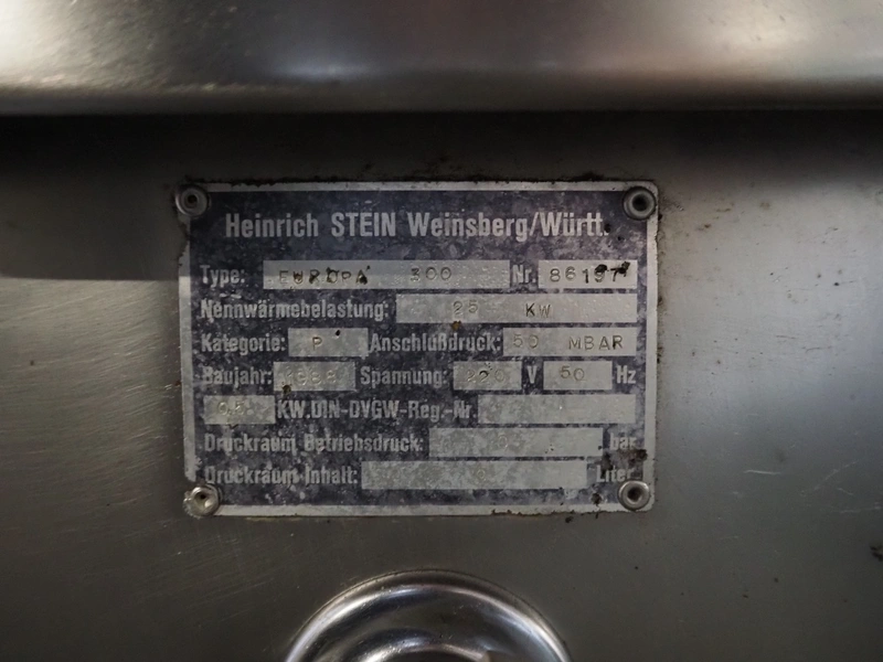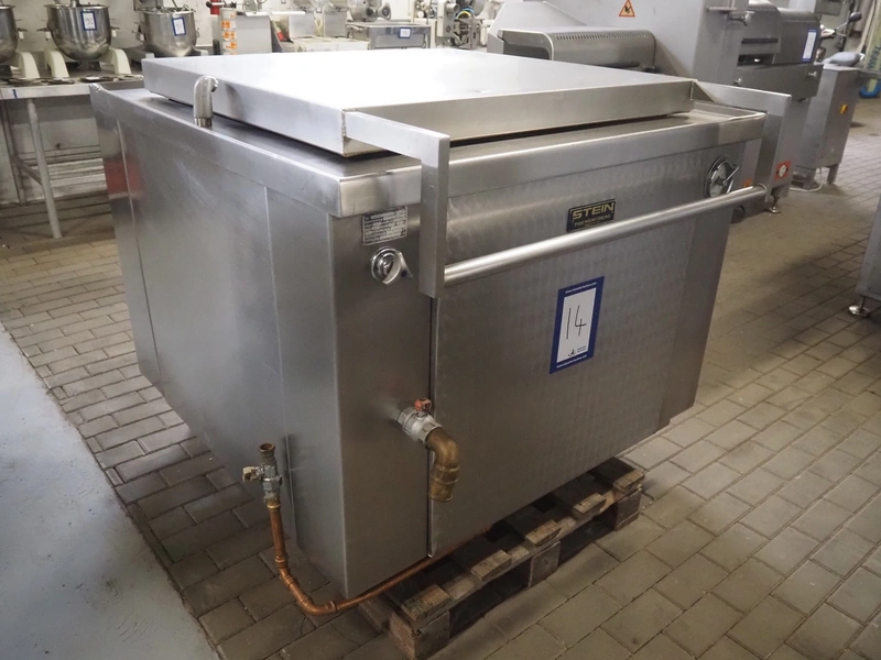 Stein cooking kettle, type: EUROPA 300, number: 86197, year of construction: 1988, 220 V, 50 Hz, 25 kW, inside dimensions: 850 mm x 950 mm x 430 mm, total dimensions: 1330 mm x 1250 mm x 1150 mm.