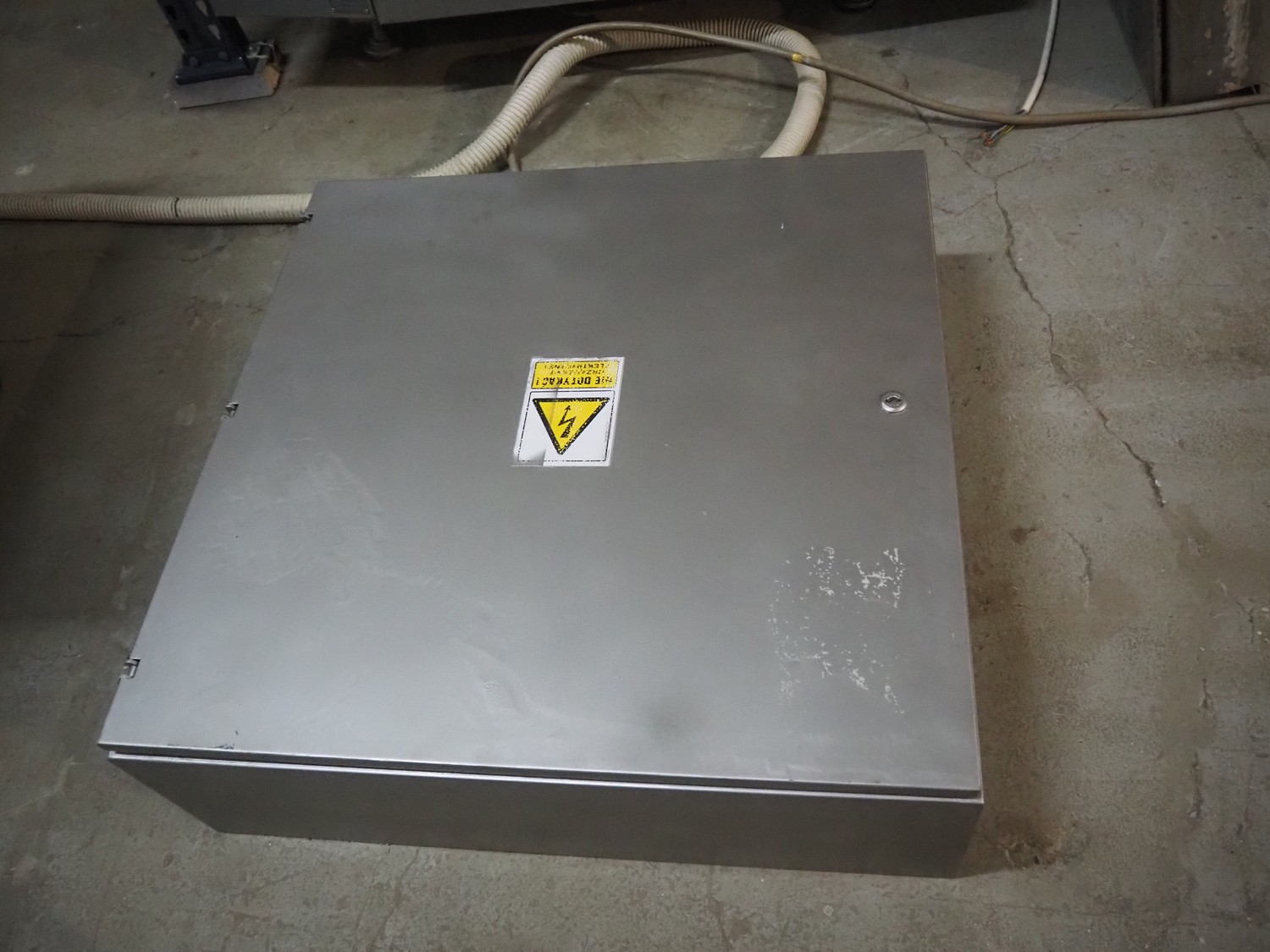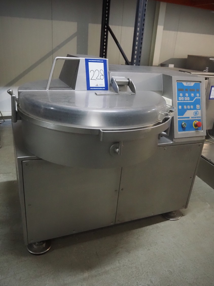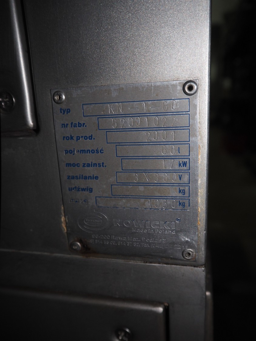 Nowicki cutter, type: KN-1-60, s/s bowl, volume bowl: 60 liter, s/s knives, total dimensions: 1340 mm x 1050 mm x 1240 mm. Including s/s switch cabinet, dimensions switch cabinet: 800 mm x 250 mm x 800 mm. Lot located in Skierniewice (PL), viewing and pick up in consultation with Industrial Auctions B.V.