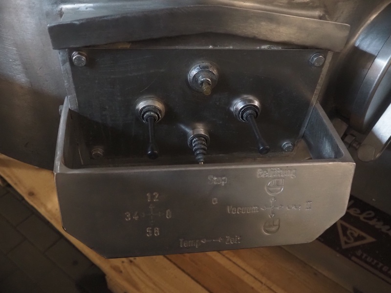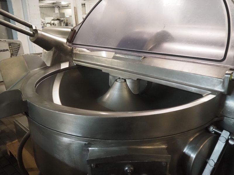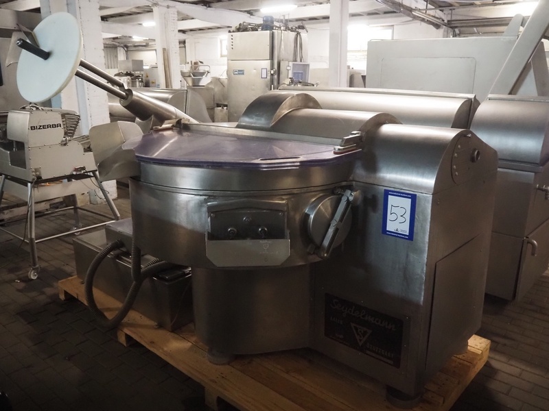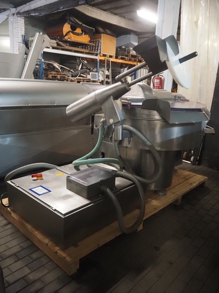 Seydelmann bowl cutter with ejector and s/s switch cabinet, type: K124 DC6 VA, serial number: 87077-1, s/s bowl, volume: 124 liter, total dimensions: 2440 mm x 1600 mm x 1800 mm.