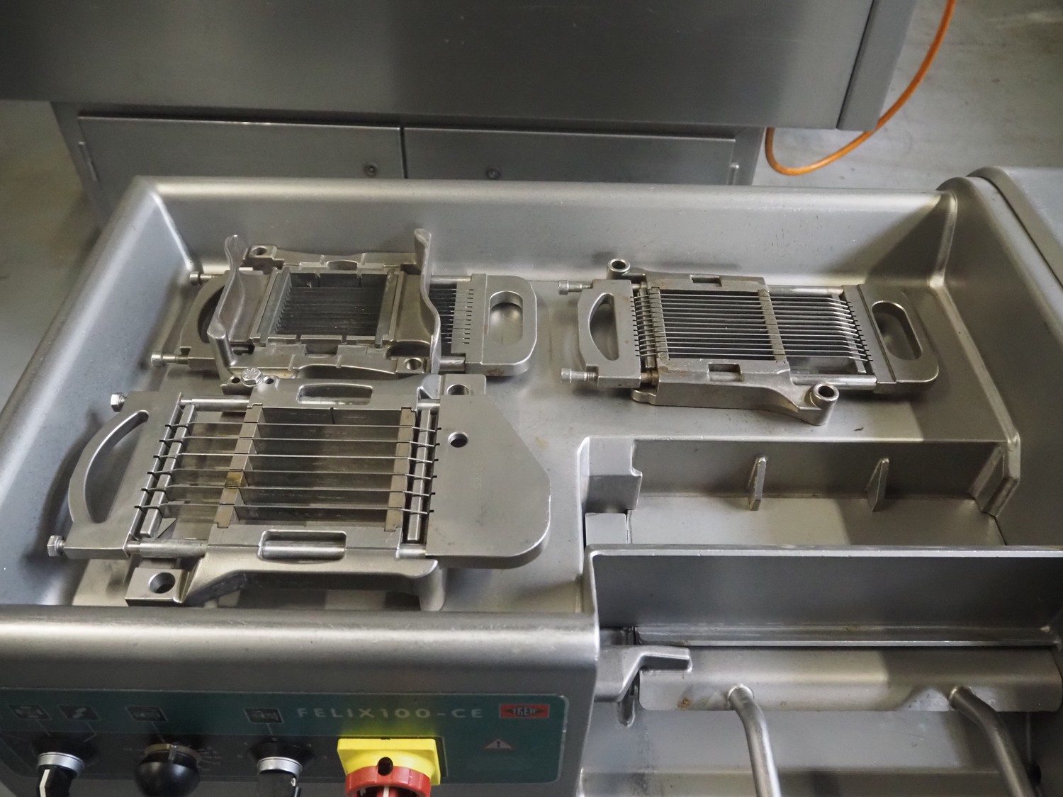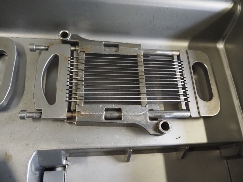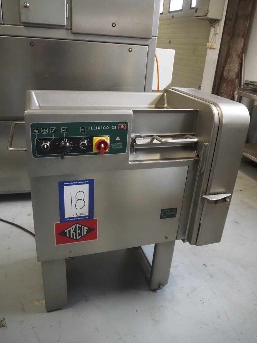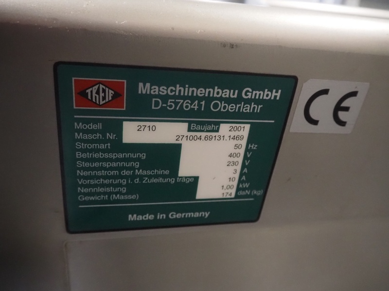 Treif Maschinenbau GmbH mobile dicer, type: 2710, machine number: 271004.69131.1469 year of construction: 2001, 230/400 V, 50 Hz, 3/10 A, 1.0 kW, machine weight: 174 kg, chamber: 300 mm x 100 mm x 100 mm, total dimensions: 1000 mm x 600 mm x 1050 mm. Including extra grids.