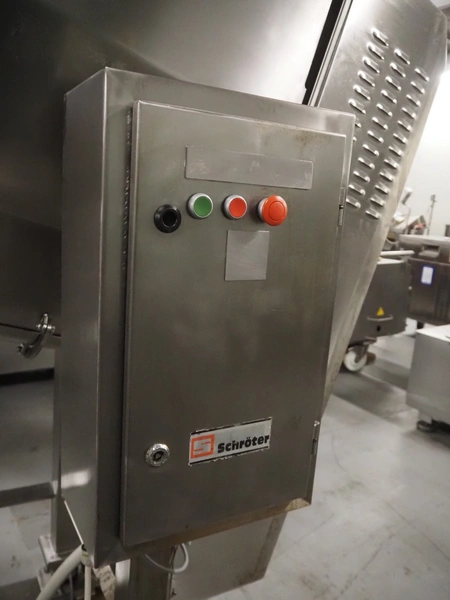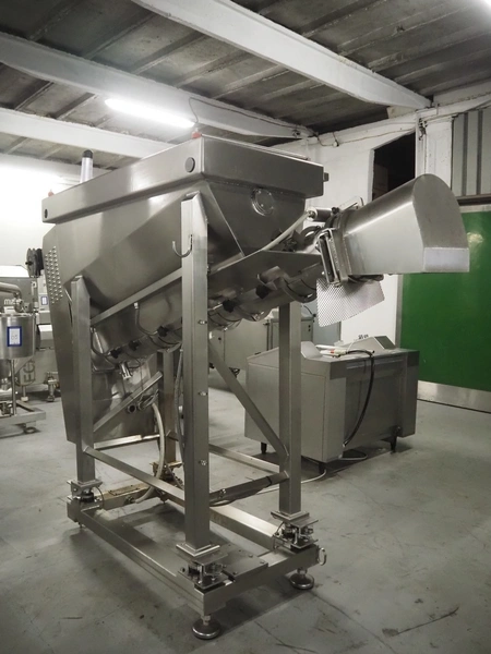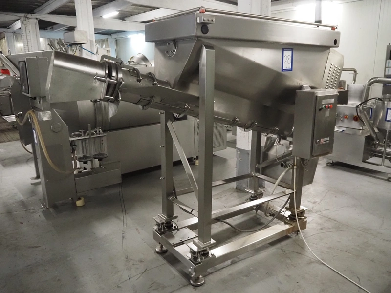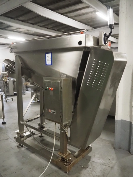 Laska Maschinenfabrik silo with paddle mixer, elevating screw and grinding head on weighing cells, type: Silo B 521, serial number: 14570, year of construction: 2013, 400 V, 3 Ph, 50 Hz, 2.6 kW, 6 A, volume: 521 liter, diameter screw: 230 mm, outfeed height: 1550 mm, total dimensions: 2900 mm x 960 mm x 2400 mm.