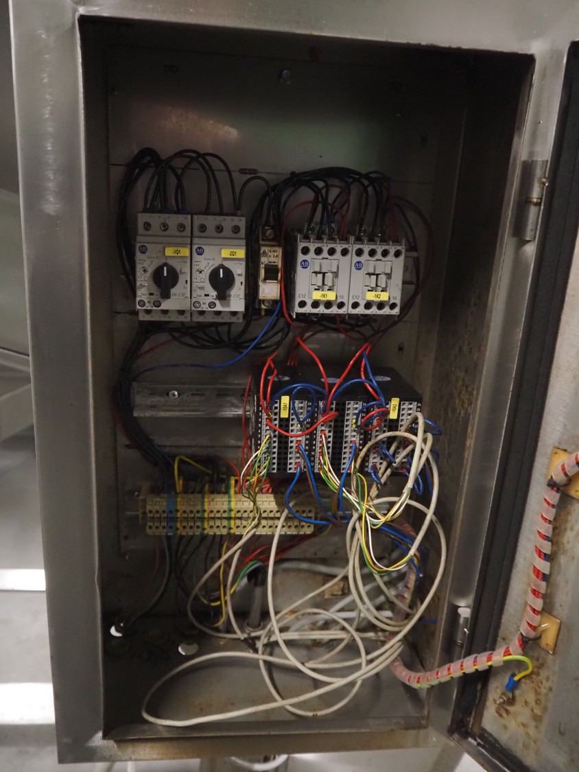 Laska Maschinenfabrik silo with paddle mixer, elevating screw and grinding head on weighing cells, type: Silo B 521, serial number: 14570, year of construction: 2013, 400 V, 3 Ph, 50 Hz, 2.6 kW, 6 A, volume: 521 liter, diameter screw: 230 mm, outfeed height: 1550 mm, total dimensions: 2900 mm x 960 mm x 2400 mm.