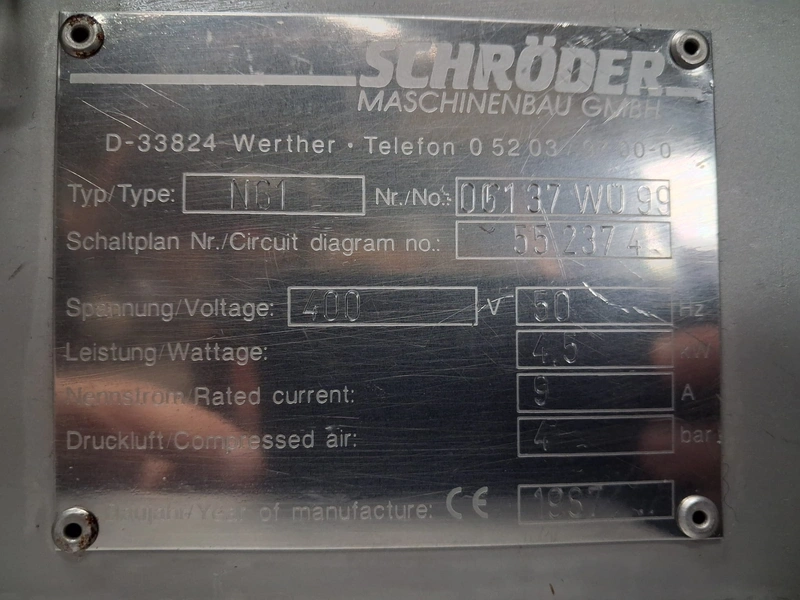 Schröder injector, type: N61, serial number: 06137WÜ99, year of construction: 1987, 50 Hz, 400 V, 9 A, 4.5 kW, 4 bar, dimensions: 2130 mm x 900 mm x 1950 mm. Lot located in Sławogóra (PL), viewing and pick up in consultation with Industrial Auctions B.V.