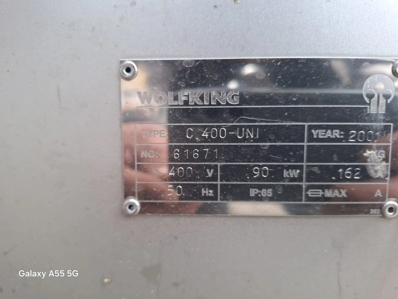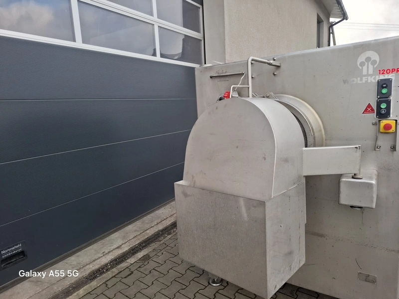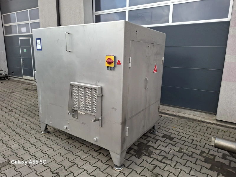 Wolfking grinder, type: C.400-UNI, number: 61671, year of construction: 2001, 400 V, 50 Hz, 162 A, 90 kW, dimensions: 2900 mm x 2100 mm x 1900 mm, Carnitech A/S lifter for 200 liter meat bins, type: L 25, number: 388, year of construction: 1986, 3 x 220 V, 50 Hz, 0.55 kW, Wolfking switch cabinet. Lot located in Sławogóra (PL), viewing and pick up in consultation with Industrial Auctions B.V.