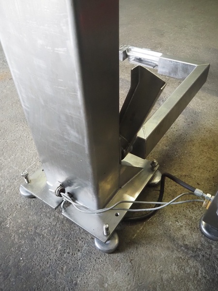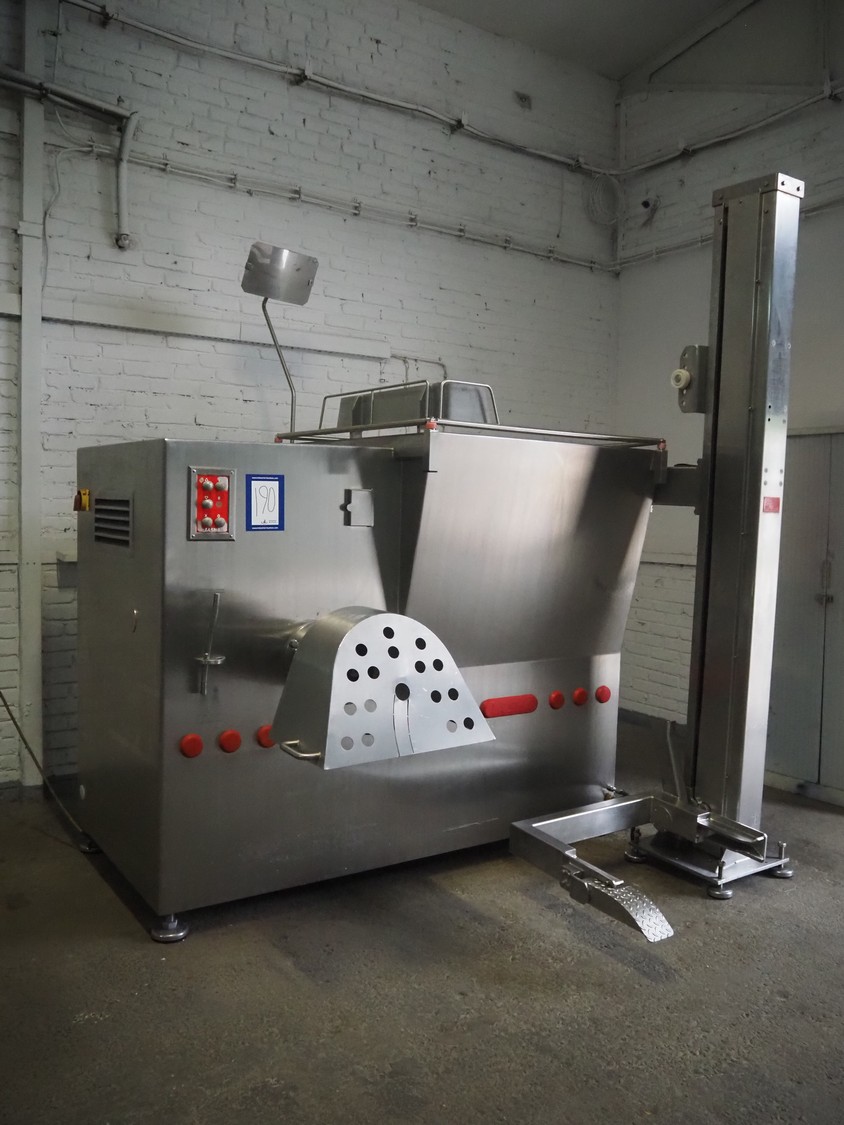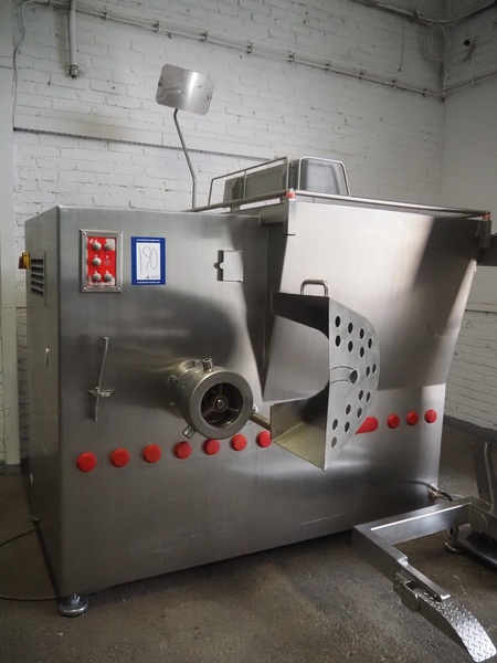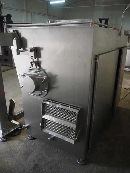 Laska Maschinenfabrik frozen block grinder with lifter for 200 liter meat bins, type: WWB 200, number: 12489, year of construction: 2007, 400 V, 3 Ph, 50 Hz, 130 A, 68 kW, 55 Ip, plate diameter: 200 mm, Laska Maschinenfabrik lifter, type: BA 24, number: 13027, year of construction: 2009, 400 V, 3 Ph, 50 Hz, 3.5 A, 1.5 kW, 55 Ip, lifting height: 2100 mm, total dimensions: 2500 mm x 2100 mm x 2850 mm. Lot located in Skierniewice (PL), viewing and pick up in consultation with Industrial Auctions B.V.