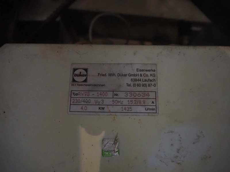 Düker grinder, type: AW98-1400, serial number: 330634, 230/400 V, 3 Ph, 50 Hz, 15.2/8.8 A, 4 kW, diameter plate: Ø 970 mm, perforations: Ø 3 mm, total dimensions: 1030 mm x 900 mm x 1150 mm. Lot located in Skierniewice (PL), viewing and pick up in consultation with Industrial Auctions B.V.