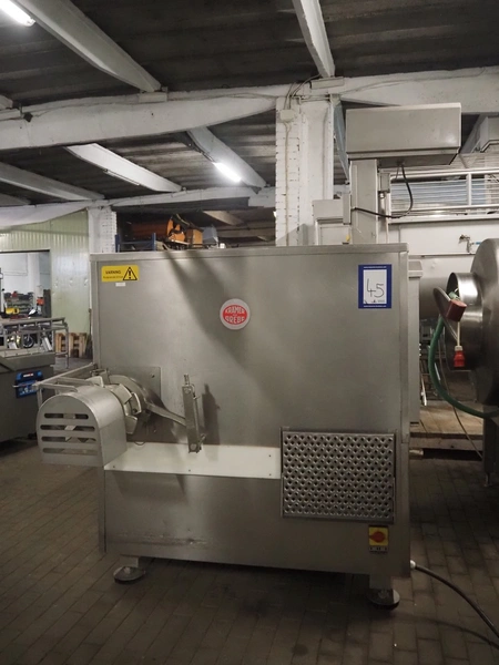 Kramer + Grebe grinder with Carsø lifter for 200 liter meat bins, type grinder: WW 160, number: 197/460/1, year of construction: 1987, diameter plate: 160 mm, type lifter: HKV200, number: SM 9879364, year of construction: 2009, 400 V, 3 Ph, 0.75 kW, total dimensions: 2320 mm x 1900 mm x 2600 mm. Including s/s tool trolley with plates and knives, dimensions tool trolley: 1450 mm x 630 mm x 1530 mm.