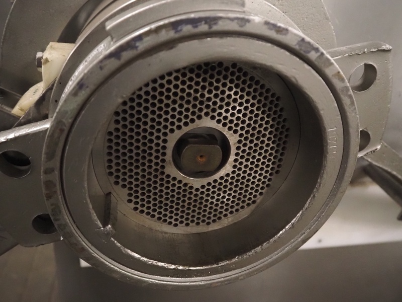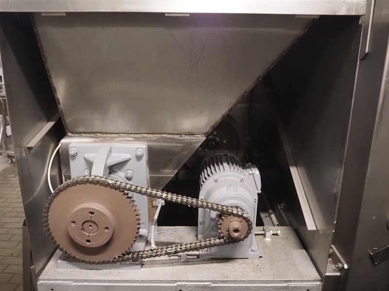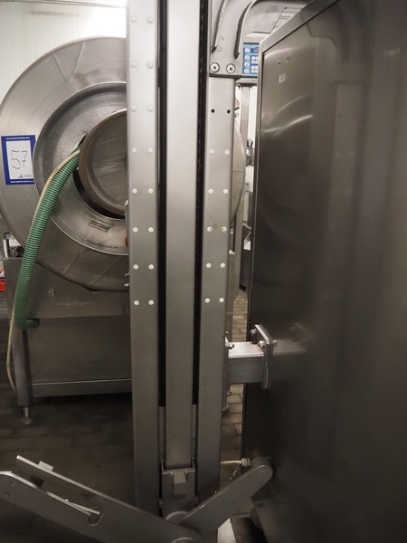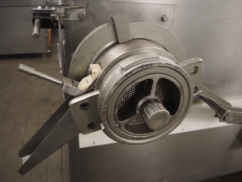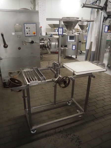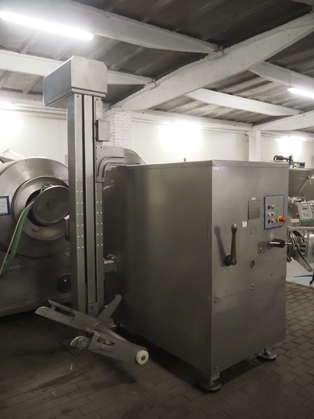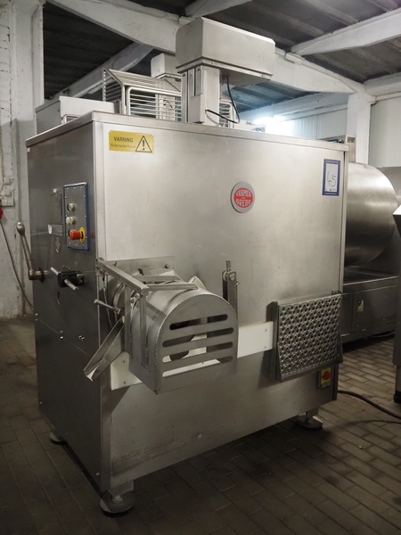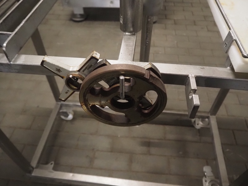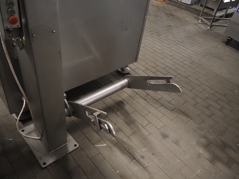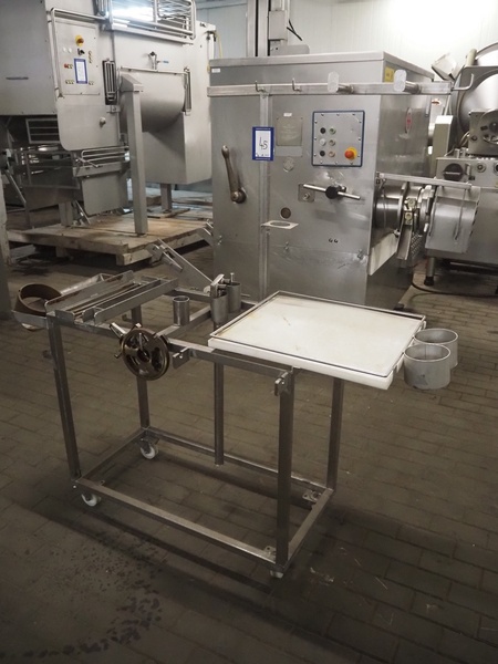 Kramer + Grebe grinder with Carsø lifter for 200 liter meat bins, type grinder: WW 160, number: 197/460/1, year of construction: 1987, diameter plate: 160 mm, type lifter: HKV200, number: SM 9879364, year of construction: 2009, 400 V, 3 Ph, 0.75 kW, total dimensions: 2320 mm x 1900 mm x 2600 mm. Including s/s tool trolley with plates and knives, dimensions tool trolley: 1450 mm x 630 mm x 1530 mm.