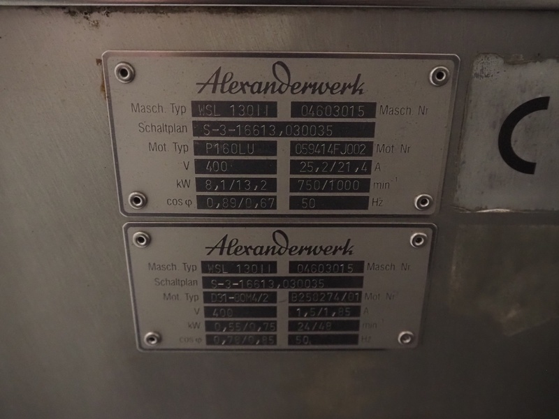 Alexanderwerk grinder, type: WSL 130II, number: 04603015, 400 V, 50 Hz, 25.2/21.4 A, 8.1/13.2 kW, diameter plate: 130 mm, total dimensions: 1050 mm x 950 mm x 1400 mm.