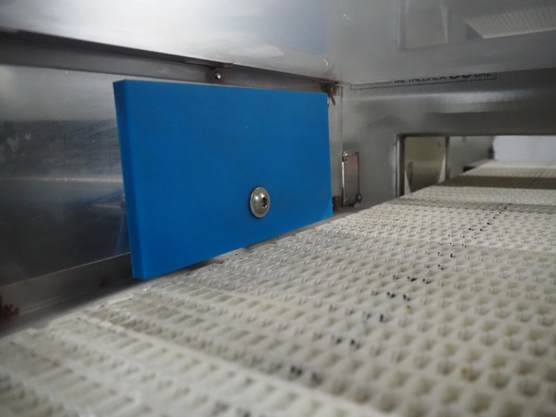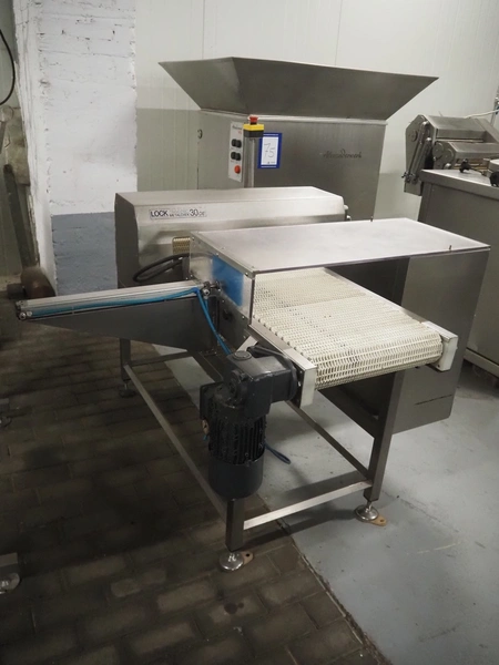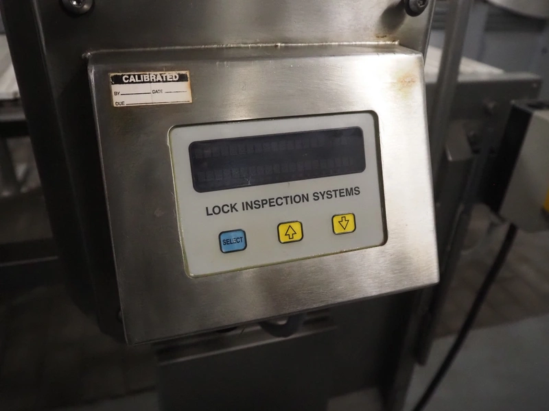 Lock Inspection Systems metal detector with rejector, type: 00006919, number: 99/0011, year of construction: APR-1999, plastic mesh belt, belt width: 400 mm, clearance: 460 mm x 70 mm, total dimensions: 1530 mm x 1430 mm x 1250 mm.