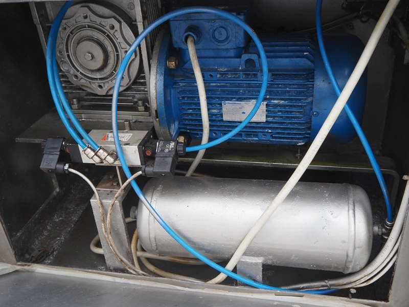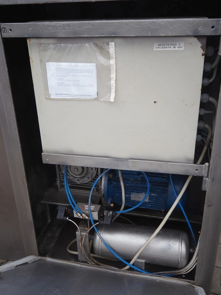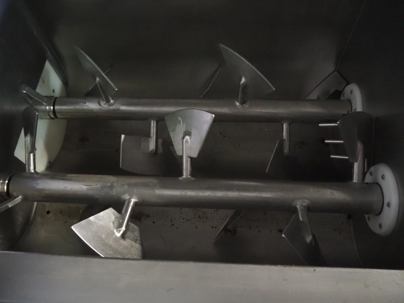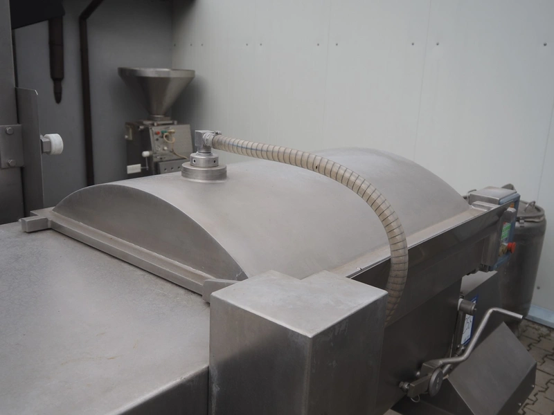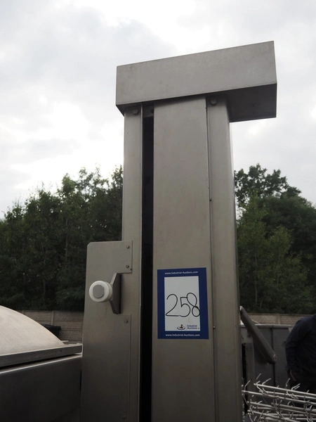 Risco double shaft paddle vacuum mixer with lifter for meat bins, model: RS 450 SV, serial number: J199002, year of construction: 1999, 400 V, 3 Ph, 50 Hz, 5.1 kW, 965 kg, volume: 450 liter, dimensions: 2200 mm x 1900 mm x 2450 mm. Without vacuum pump. Lot located in Skierniewice (PL), viewing and pick up in consultation with Industrial Auctions B.V.