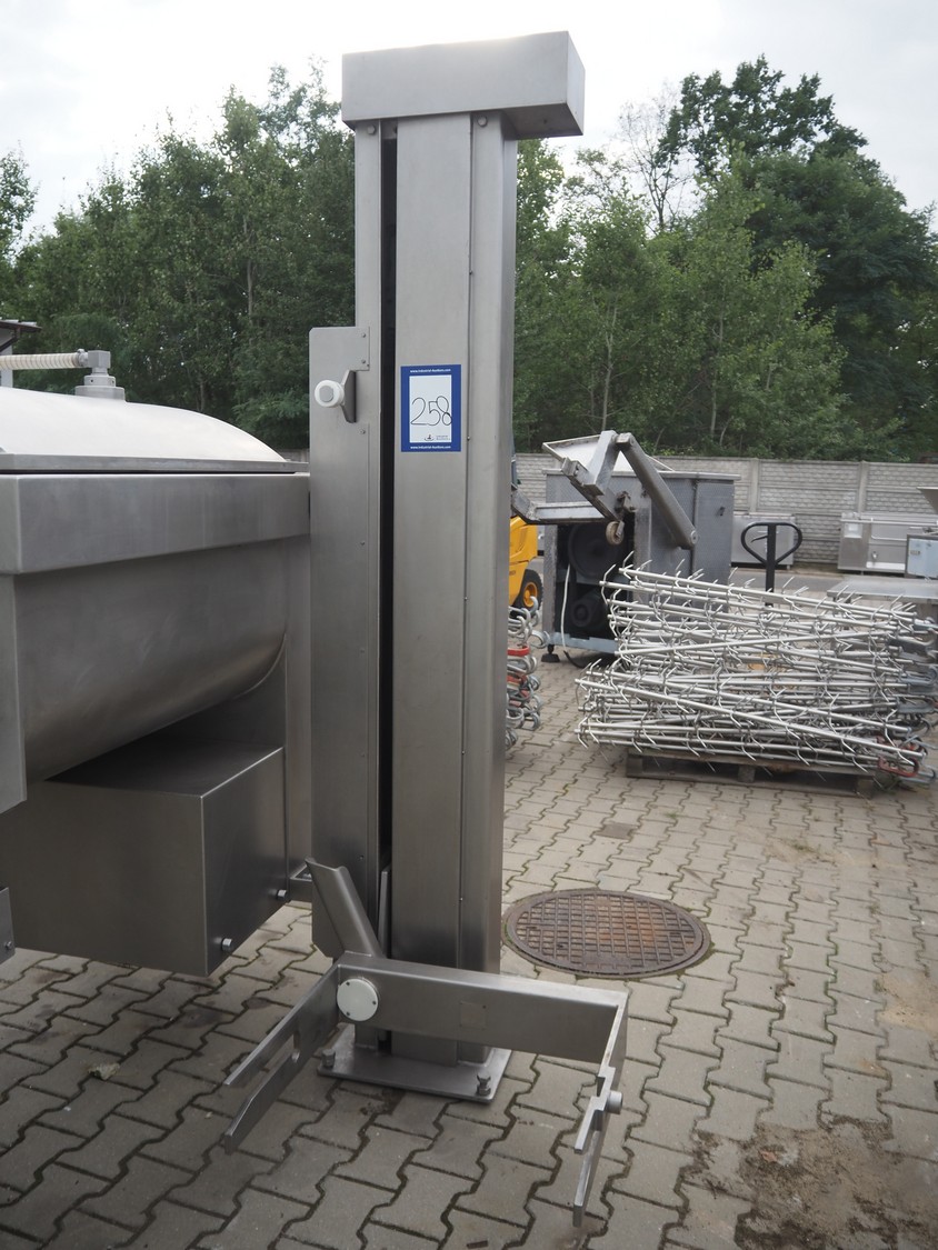 Risco double shaft paddle vacuum mixer with lifter for meat bins, model: RS 450 SV, serial number: J199002, year of construction: 1999, 400 V, 3 Ph, 50 Hz, 5.1 kW, 965 kg, volume: 450 liter, dimensions: 2200 mm x 1900 mm x 2450 mm. Without vacuum pump. Lot located in Skierniewice (PL), viewing and pick up in consultation with Industrial Auctions B.V.