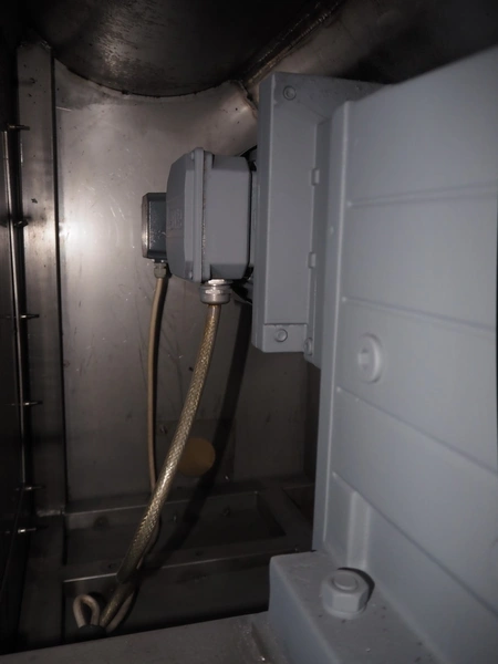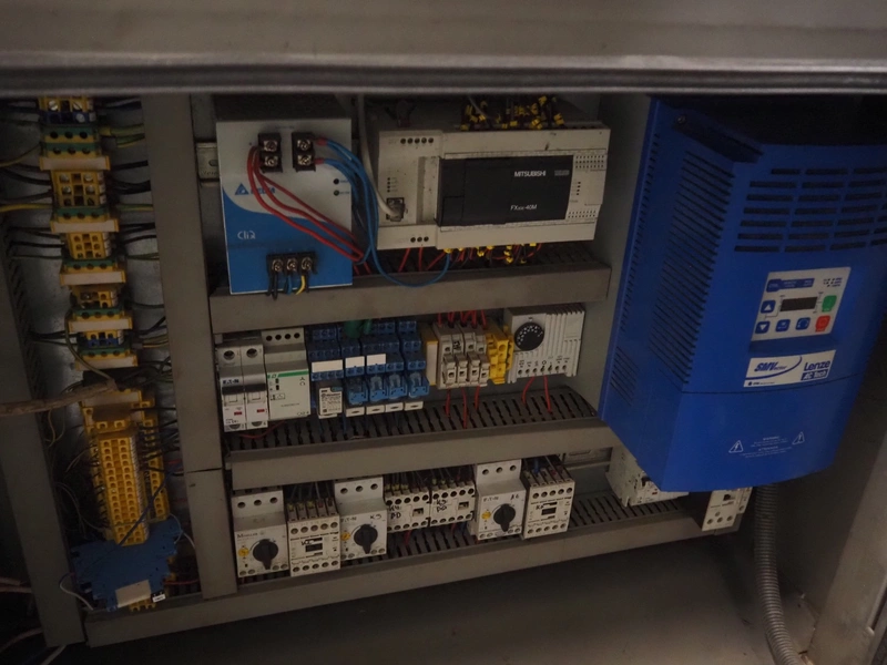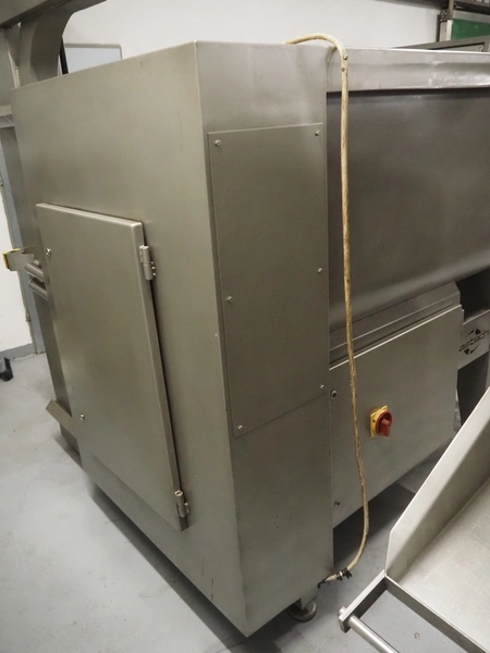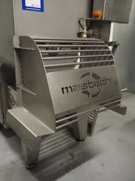 Mastech double shaft paddle mixer with lifter for 200 liter meat bins, type: MS-950, number: 001, year of construction: 2011, 400 V, weight: 1560 kg, volume: 950 liter, length paddles: (2x) 1500 mm, total dimensions: 2060 mm x 2100 mm x 2860 mm.