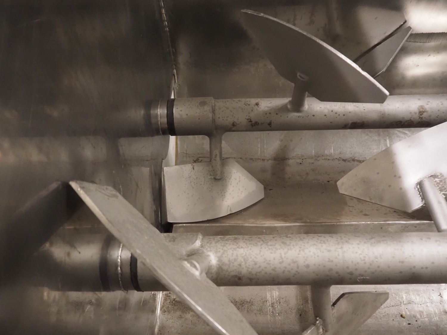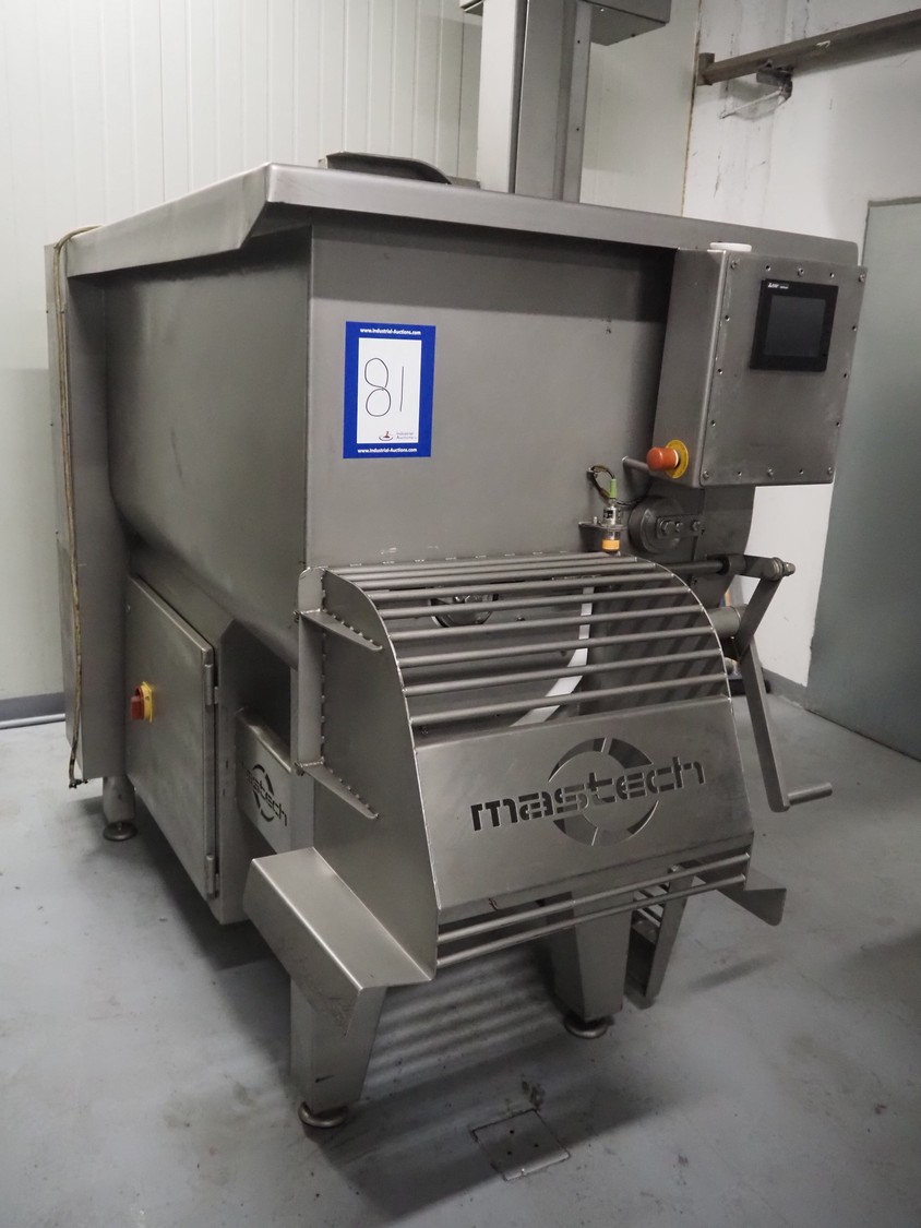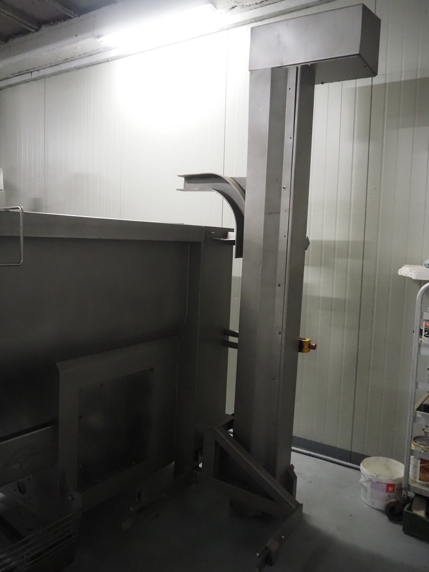 Mastech double shaft paddle mixer with lifter for 200 liter meat bins, type: MS-950, number: 001, year of construction: 2011, 400 V, weight: 1560 kg, volume: 950 liter, length paddles: (2x) 1500 mm, total dimensions: 2060 mm x 2100 mm x 2860 mm.