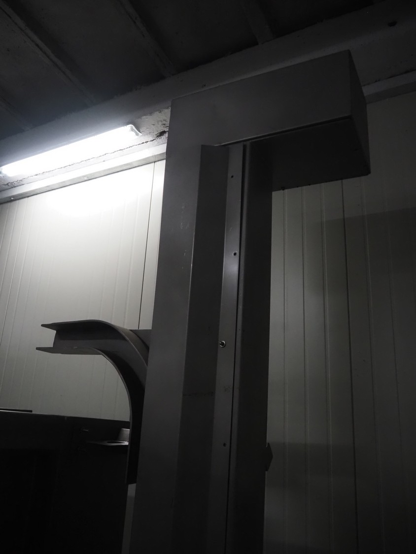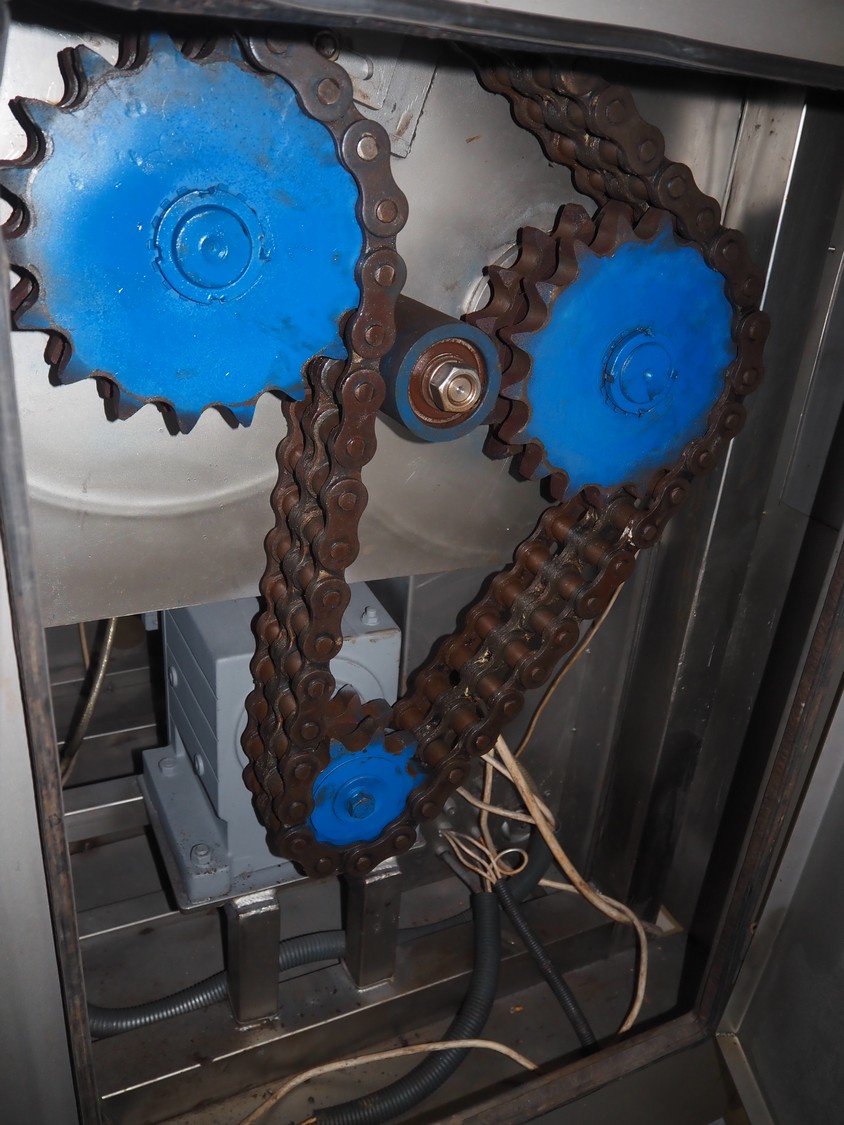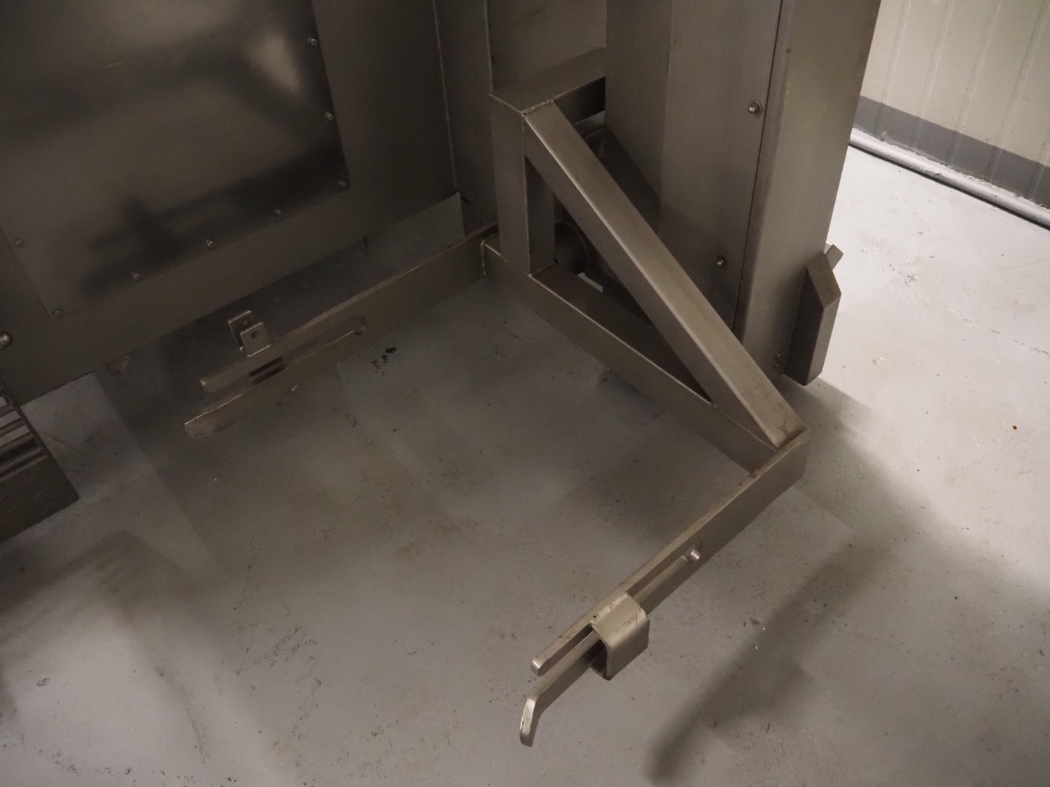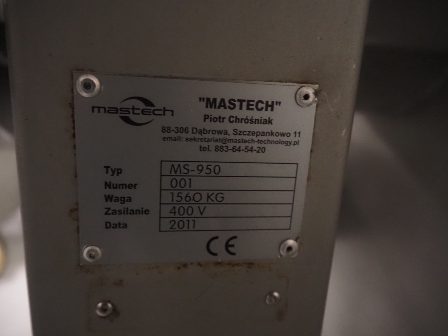 Mastech double shaft paddle mixer with lifter for 200 liter meat bins, type: MS-950, number: 001, year of construction: 2011, 400 V, weight: 1560 kg, volume: 950 liter, length paddles: (2x) 1500 mm, total dimensions: 2060 mm x 2100 mm x 2860 mm.