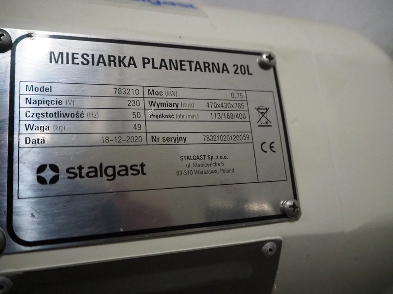 Stalgast SP. Z.o.o. table model mixer, model: 783210, serial number: 78321020120059, year of construction: 18-12-2020, 230 V, 50 Hz, 0.75 kW, 49 kg, volume: 20 liter, dimensions: 450 mm x 550 mm x 780 mm. Including whisk, paddle and spiral.