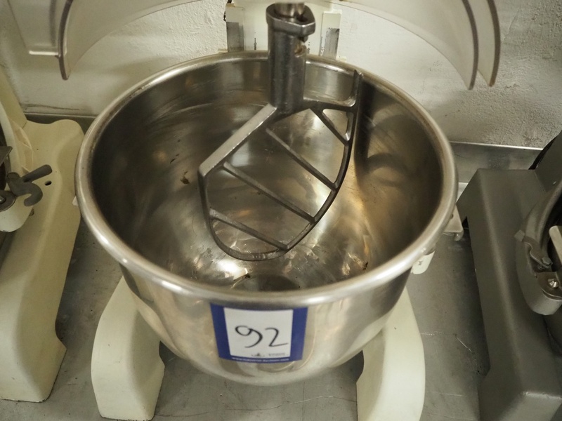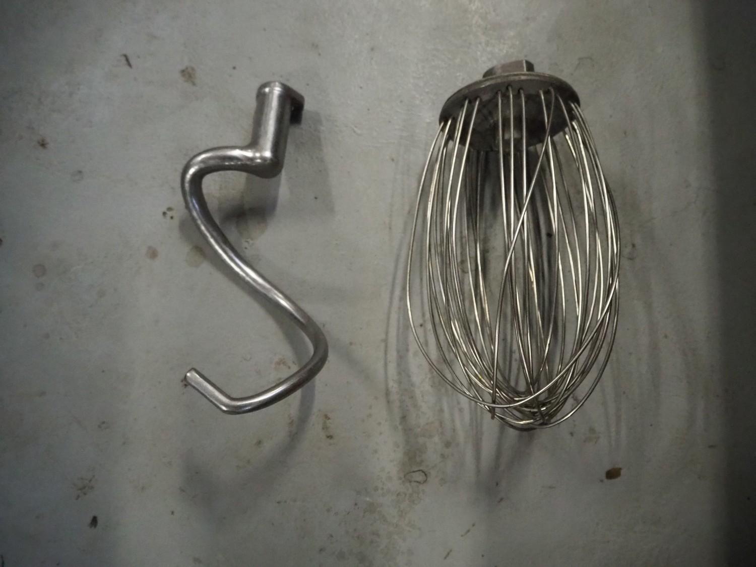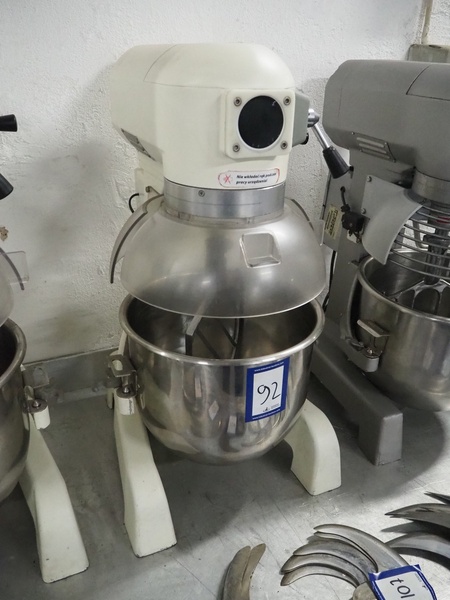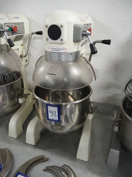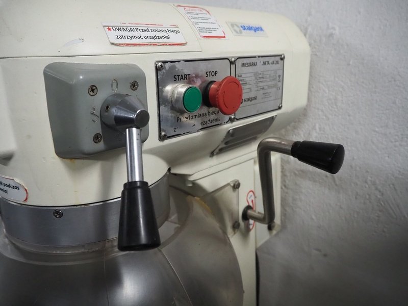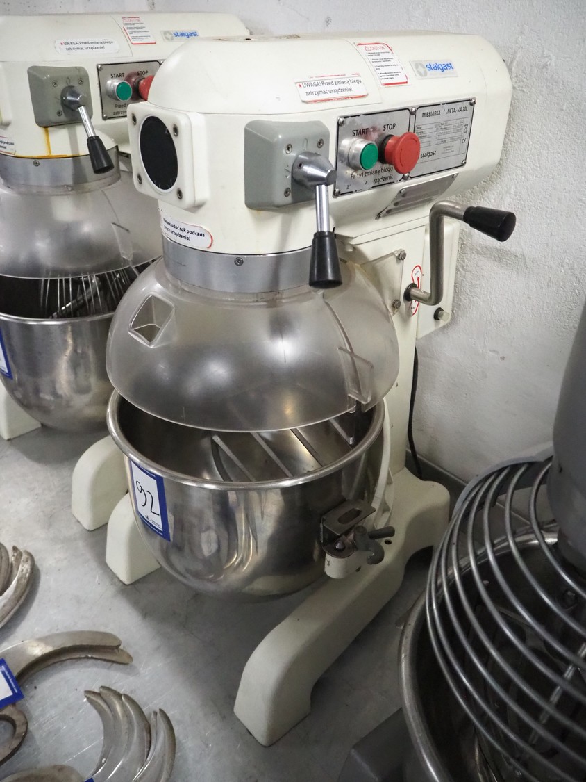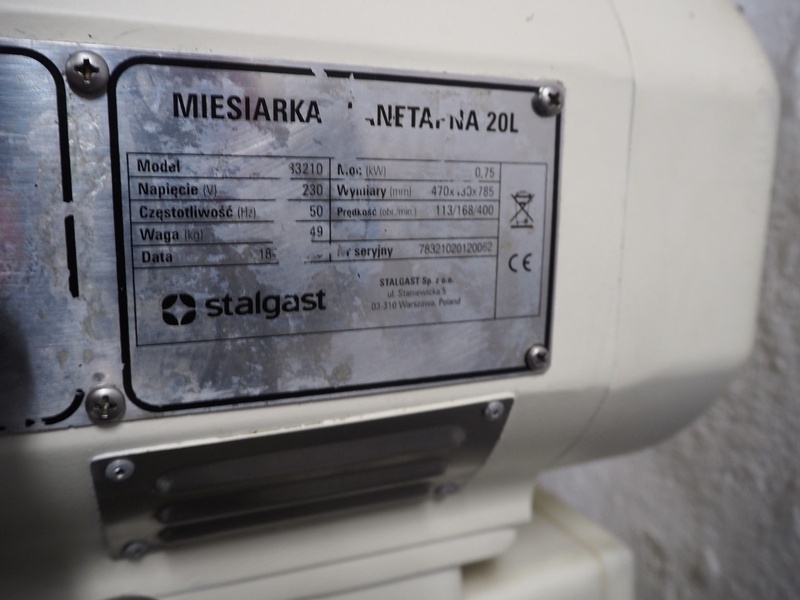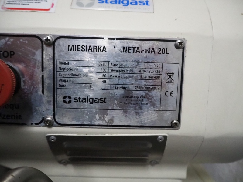Stalgast SP. Z.o.o. table model mixer, model: 783210, serial number: 78321020120062, 230 V, 50 Hz, 0.75 kW, 49 kg, volume: 20 liter, dimensions: 450 mm x 550 mm x 780 mm. Including whisk, paddle and spiral.