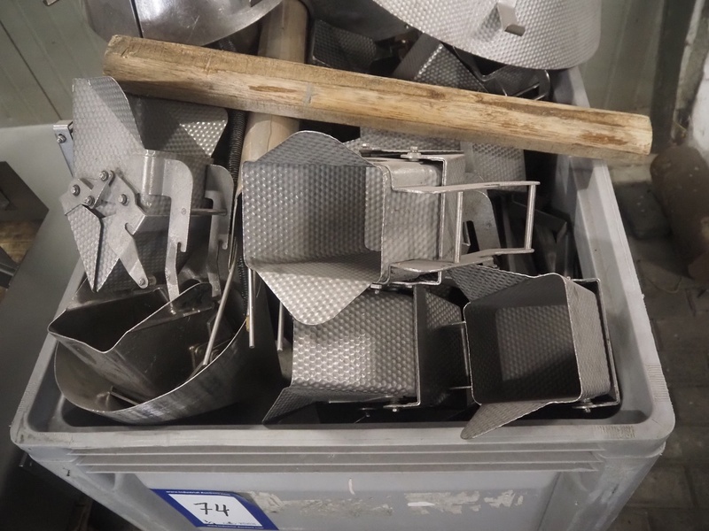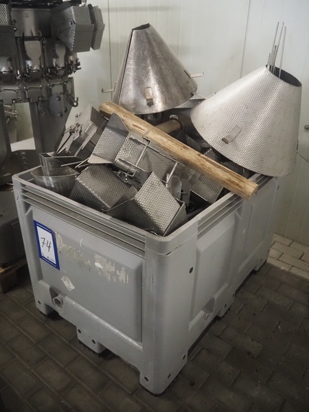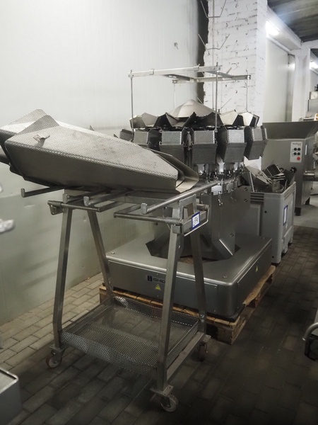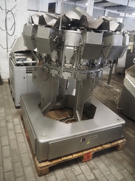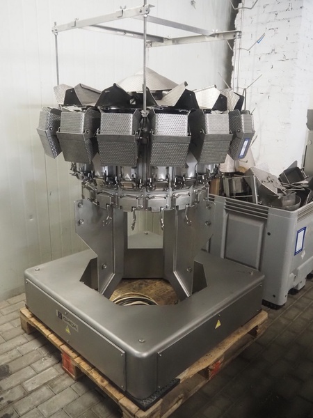 Ishida 16 heads multihead weigher, model: CCW-M-216B-2M/15-SS, number: 42462, year of construction: June 2001, 380 V, 3 Ph, 50 Hz, 6.2 A, each basket: 150 mm x 140 mm x 220 mm, total dimensions: 1150 mm x 1150 mm x 1750 mm. Including pallet box with parts and tool trolley, dimensions pallet box: 1200 mm x 800 mm x 1400 mm, dimensions tool trolley: 1040 mm x 950 mm x 1500 mm.
