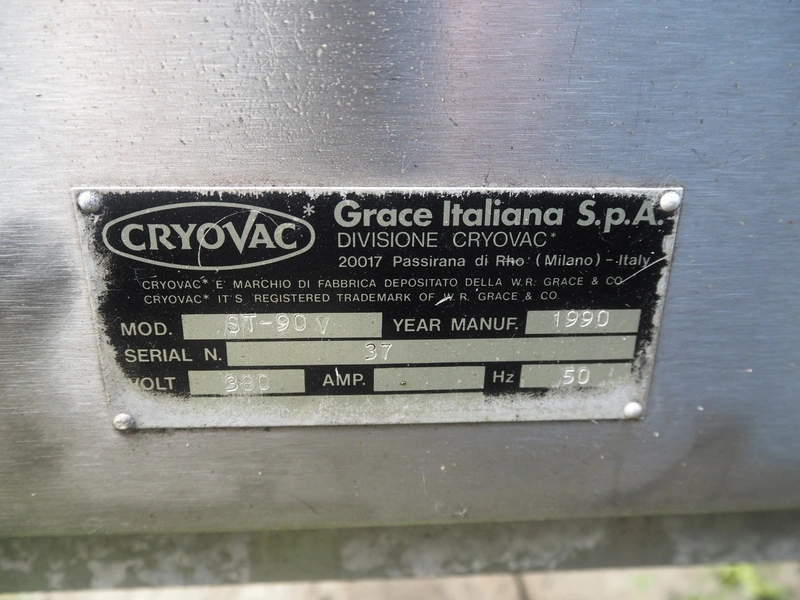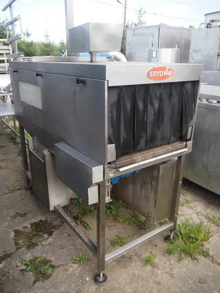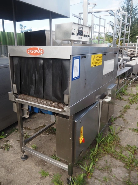 Cryovac shrink tunnel, model: ST-90 V, serial number: 37, year of construction: 1990, 380 V, 50 Hz, mesh belt, belt width: 600 mm, clearance: 560 mm x 410 mm, total dimensions: 1900 mm x 850 mm x 2100 mm.